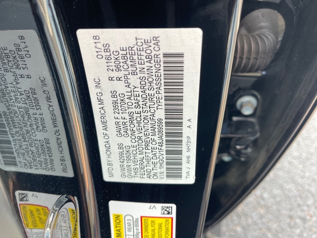 Crystal Black Pearl 2018 Honda Accord EX 1.5T I4 DOHC 16V Turbocharged VTEC CVT FWDBlack Cloth, 17 Machine-Finished Alloy Wheels, 4-Wheel Disc Brakes, 8 Speakers, ABS brakes, Air Conditioning, Alloy wheels, AM/FM radio: SiriusXM, Apple CarPlay/Android Auto, Auto High-beam Headlights, Automatic temperature control, Blind Spot Information (BSI) System warning, Brake assist, Bumpers: body-color, Cloth Seat Trim, Delay-off headlights, Driver door bin, Driver vanity mirror, Dual front impact airbags, Dual front side impact airbags, Electronic Stability Control, Emergency communication system: HondaLink, Exterior Parking Camera Rear, Four wheel independent suspension, Front anti-roll bar, Front Bucket Seats, Front Center Armrest, Front dual zone A/C, Front fog lights, Front reading lights, Fully automatic headlights, Heated door mirrors, Heated Front Bucket Seats, Heated front seats, Illuminated entry, Knee airbag, Low tire pressure warning, Occupant sensing airbag, Outside temperature display, Overhead airbag, Overhead console, Panic alarm, Passenger door bin, Passenger vanity mirror, Power door mirrors, Power driver seat, Power moonroof, Power steering, Power windows, Radio data system, Radio: 180-Watt AM/FM/HD/SiriusXM Audio System, Rear anti-roll bar, Rear seat center armrest, Rear window defroster, Remote keyless entry, Security system, Speed control, Speed-sensing steering, Speed-Sensitive Wipers, Split folding rear seat, Steering wheel mounted audio controls, Tachometer, Telescoping steering wheel, Tilt steering wheel, Traction control, Trip computer, Variably intermittent wipers, Black Cloth.IT'S WORTH THE DRIVE TO BONDY'S ENTERPRISE TOYOTA!!!Awards: * JD Power Automotive Performance, Execution and Layout (APEAL) Study * ALG Residual Value Awards, Residual Value Awards * NACTOY 2018 North American Car of the Year * 2018 KBB.com 10 Most Awarded Brands * 2018 KBB.com Brand Image AwardsKelley Blue Book Brand Image Awards are b