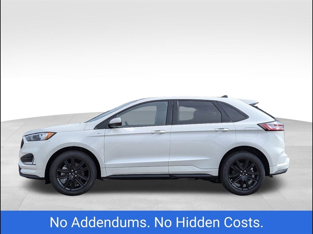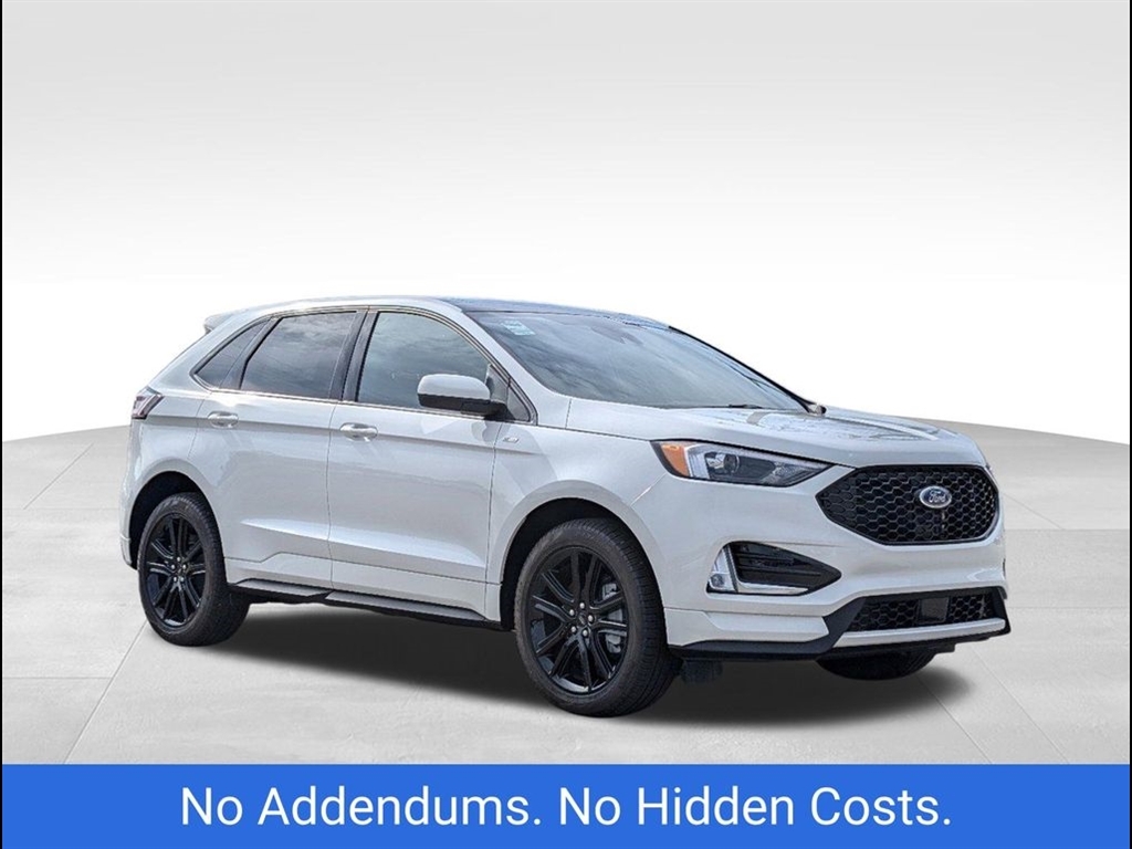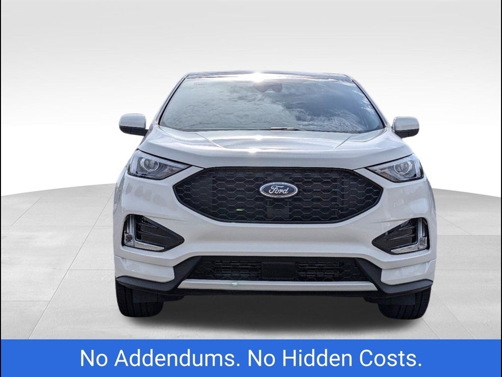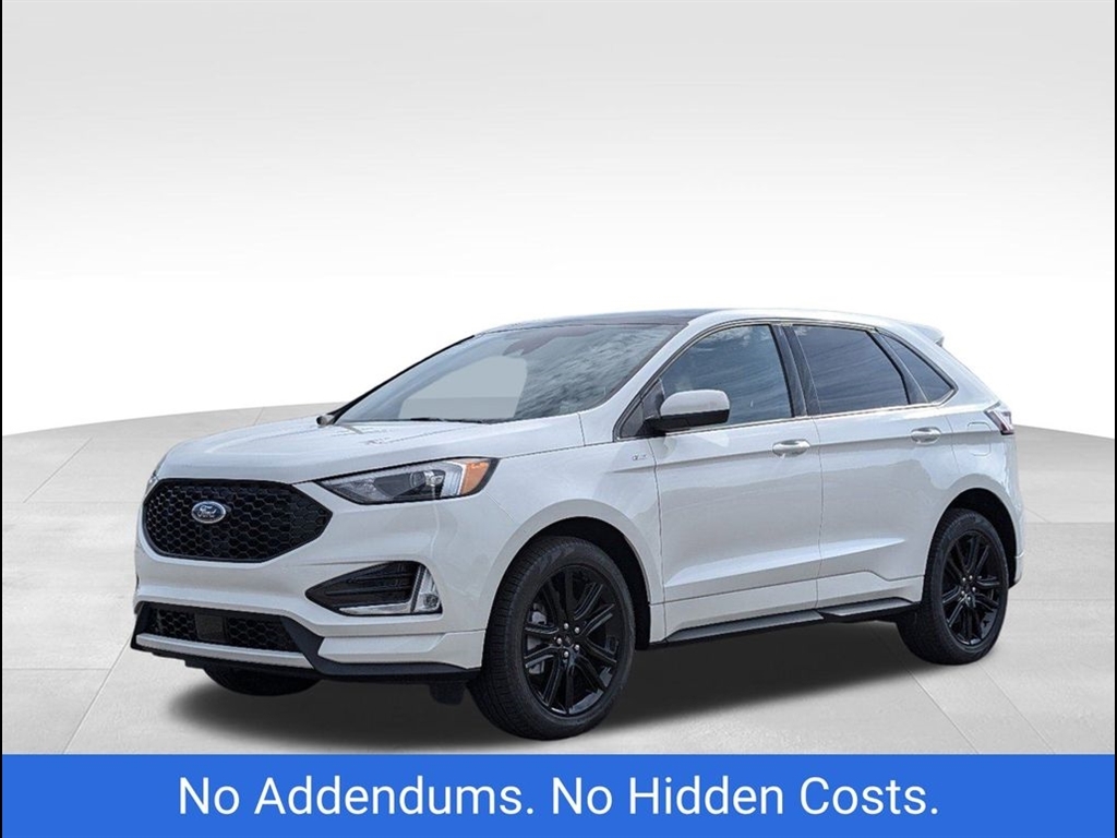 The 2024 Ford Edge ST-Line in Star White Metallic Tri-Coat offers a sleek, modern design with performance-driven features. Powered by a robust 2.7L V6 engine, this Edge delivers an exciting driving experience while maintaining excellent fuel efficiency. The bold exterior is complemented by the signature Star White Metallic Tri-Coat paint, offering a sophisticated, dynamic shine that stands out on the road. Inside, the ST-Line trim boasts premium materials, including leather-trimmed seats with contrasting red stitching, providing both style and comfort. The spacious cabin is designed for convenience, featuring a large 12-inch digital display, SYNC 4 technology, and Apple CarPlay/Android Auto compatibility for seamless connectivity. The rearview camera and parking sensors enhance safety while maneuvering, ensuring peace of mind during every drive. For performance enthusiasts, the ST-Lines sport-tuned suspension and 20-inch alloy wheels provide an agile and responsive ride. The SUV also comes equipped with Ford�s Co-Pilot360 suite, offering advanced safety features such as blind-spot monitoring, lane-keeping assist, and automatic emergency braking. The vehicles panoramic sunroof allows for an open, airy feel, and the hands-free liftgate adds an extra level of convenience. This 2024 Ford Edge ST-Line combines impressive power, luxury, and cutting-edge technology, making it the perfect choice for those seeking both style and performance in their next SUV.