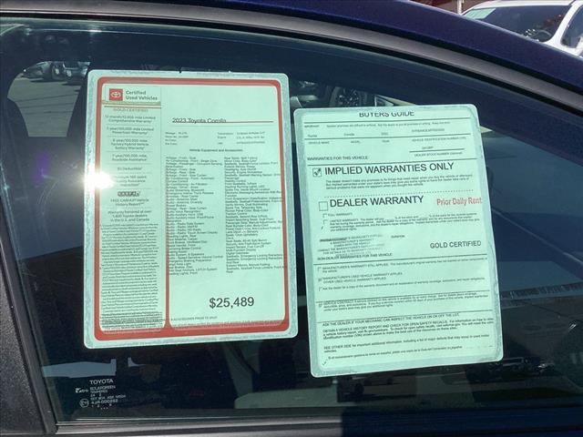 CARFAX One-Owner. Clean CARFAX. Certified. Toyota Gold Certified Details: * 160 Point Inspection * Transferable Warranty * Vehicle History * Roadside Assistance for 7 Year / 100,000 Mile. Standard New-Car Financing Rates Available. Warranty honored at over 1,400 Toyota dealers in the continental U.S. & Canada. Trade-ins accepted. Trouble-free handling of your transaction, including DMV paperwork * Limited Warranty: 12 Month/12,000 Mile Limited Comprehensive Warranty: 12 Month/12,000 Mile (whichever comes first) from certified purchase date * Powertrain Limited Warranty: 84 Month/100,000 Mile (whichever comes first) from TCUV purchase date * Roadside Assistance * Warranty Deductible: $0 2023 Toyota Corolla LE 32/41 City/Highway MPG Odometer is 2150 miles below market average! We make it easy for you with a rigorous multi-point full vehicle inspection to ensure the cars we sell are ready for a safe drive on the road. Toyota of Lancaster is your Antelope Valley Toyota Dealer. Come on down today to 43301 12th St. West Lancaster, CA 93534 and make your dreams come true.