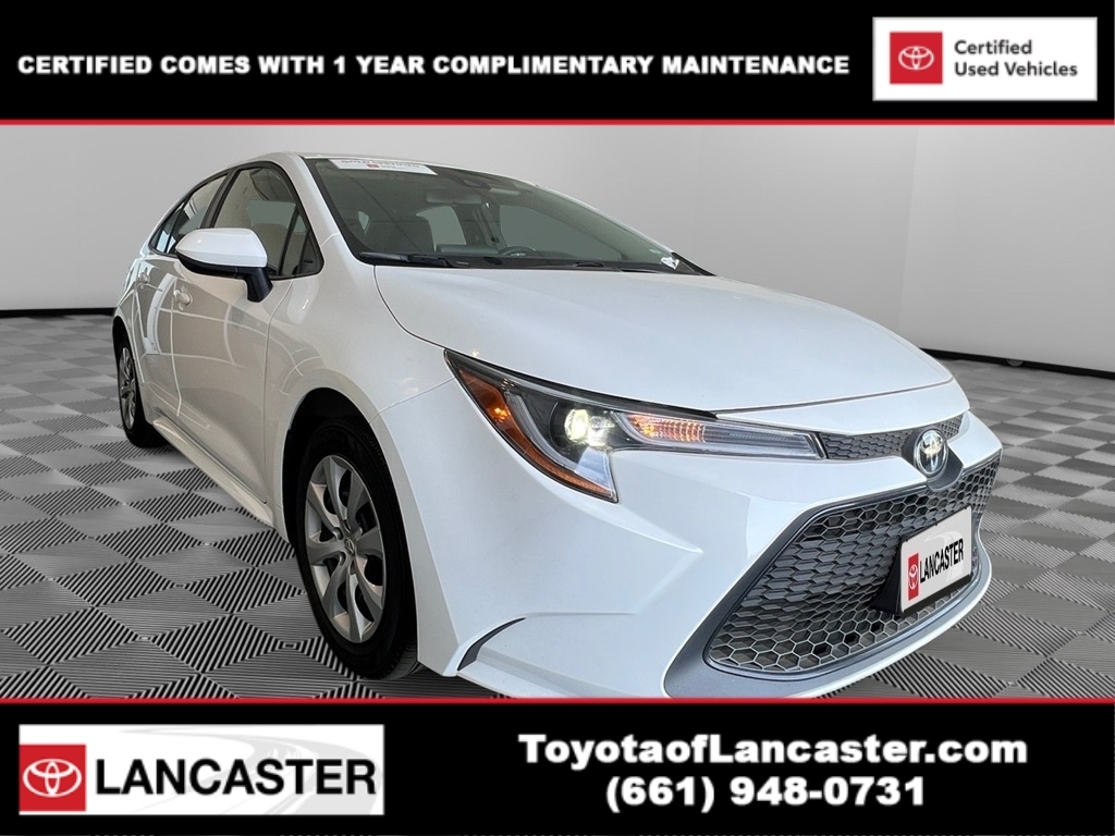 Certified. Toyota Gold Certified Details: * 160 Point Inspection * Limited Warranty: 12 Month/12,000 Mile Limited Comprehensive Warranty: 12 Month/12,000 Mile (whichever comes first) from certified purchase date * Vehicle History * Roadside Assistance for 7 Year / 100,000 Mile. Standard New-Car Financing Rates Available. Warranty honored at over 1,400 Toyota dealers in the continental U.S. & Canada. Trade-ins accepted. Trouble-free handling of your transaction, including DMV paperwork * Powertrain Limited Warranty: 84 Month/100,000 Mile (whichever comes first) from TCUV purchase date * Transferable Warranty * Warranty Deductible: $0 * Roadside Assistance 2022 Toyota Corolla LE 30/38 City/Highway MPG We make it easy for you with a rigorous multi-point full vehicle inspection to ensure the cars we sell are ready for a safe drive on the road. * Toyota of Lancaster is your Antelope Valley Toyota Dealer. Come on down today to 43301 12th St. West Lancaster, CA 93534 and make your dreams come true.*