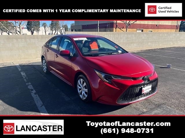 CARFAX One-Owner. Clean CARFAX. Certified. Toyota Gold Certified Details: * Powertrain Limited Warranty: 84 Month/100,000 Mile (whichever comes first) from TCUV purchase date * Vehicle History * 160 Point Inspection * Roadside Assistance * Warranty Deductible: $0 * Roadside Assistance for 7 Year / 100,000 Mile. Standard New-Car Financing Rates Available. Warranty honored at over 1,400 Toyota dealers in the continental U.S. & Canada. Trade-ins accepted. Trouble-free handling of your transaction, including DMV paperwork * Transferable Warranty * Limited Warranty: 12 Month/12,000 Mile Limited Comprehensive Warranty: 12 Month/12,000 Mile (whichever comes first) from certified purchase date 2021 Toyota Corolla LE 30/38 City/Highway MPG Odometer is 766 miles below market average! We make it easy for you with a rigorous multi-point full vehicle inspection to ensure the cars we sell are ready for a safe drive on the road. Toyota of Lancaster is your Antelope Valley Toyota Dealer. Come on down today to 43301 12th St. West Lancaster, CA 93534 and make your dreams come true.