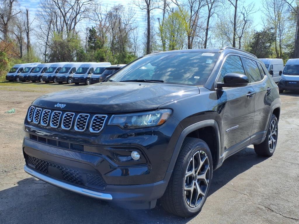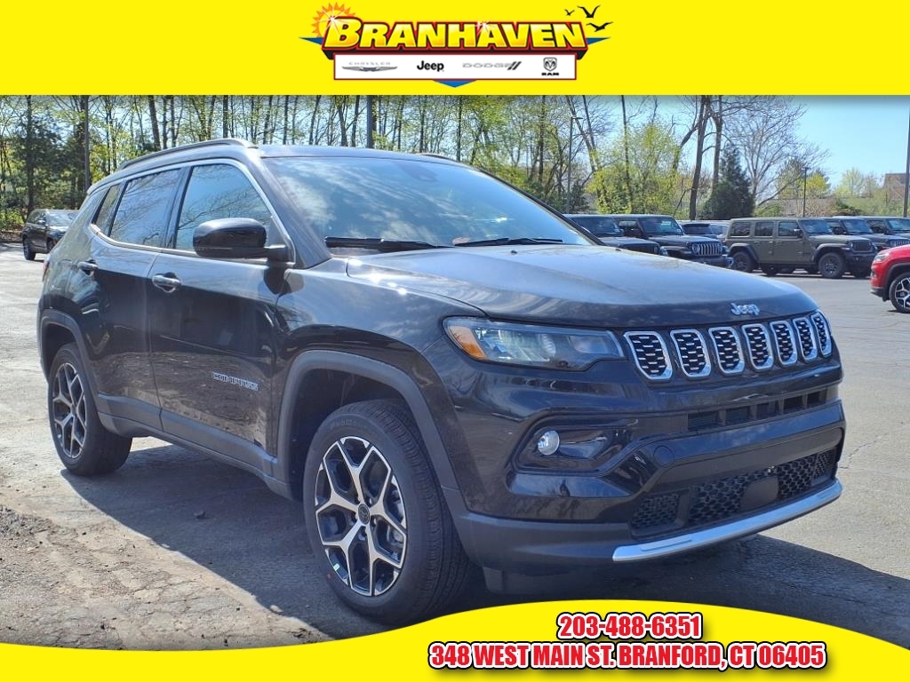 Diamond Black Crystal Pearlcoat 2025 Jeep Compass Limited 4WD 8-Speed Automatic 2.0L I4 DOHC 4WD, 10.1Touchscreen Display, 3.73 Final Drive Ratio, 4-Wheel Disc Brakes, 6 Speakers, ABS brakes, Air Conditioning, Alloy wheels, AM/FM radio: SiriusXM, Auto High-beam Headlights, Auto-dimming Rear-View mirror, Automatic temperature control, Brake assist, Bumpers: body-color, Compass, Delay-off headlights, Driver door bin, Driver vanity mirror, Dual front impact airbags, Dual front side impact airbags, Electronic Stability Control, Emergency communication system: Jeep Connect, Four wheel independent suspension, Front anti-roll bar, Front Bucket Seats, Front Center Armrest w/Storage, Front dual zone A/C, Front fog lights, Front License Plate Bracket, Front reading lights, Fully automatic headlights, Heated door mirrors, Heated front seats, Illuminated entry, Knee airbag, Leather Shift Knob, Leather steering wheel, Leatherette Seats, Low tire pressure warning, Occupant sensing airbag, Outside temperature display, Overhead airbag, Overhead console, Panic alarm, ParkView Rear Back-Up Camera, Passenger door bin, Passenger vanity mirror, Power door mirrors, Power driver seat, Power Front/Fixed Rear Full Sunroof, Power steering, Power windows, Premium Alpine Speaker System, Quick Order Package 29G, Radio: Uconnect 5 w/10.1Display, Rain sensing wipers, Rear anti-roll bar, Rear seat center armrest, Rear window defroster, Rear window wiper, Remote keyless entry, Security system, Speed control, Split folding rear seat, Spoiler, Steering wheel mounted audio controls, Sun and Sound Group, Tachometer, Telescoping steering wheel, Tilt steering wheel, Traction control, Trip computer, Turn signal indicator mirrors, Variably intermittent wipers. 24/32 City/Highway MPG