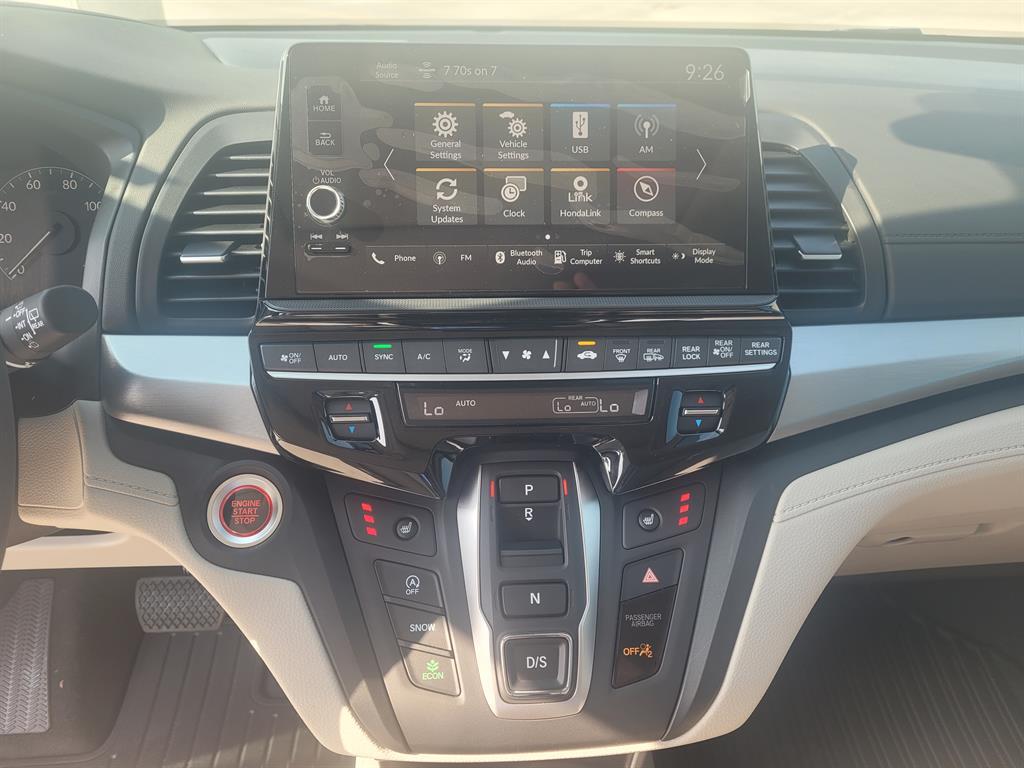 2026 Honda Odyssey EX-L 3.5L V6 SOHC i-VTEC 24V 10-Speed Automatic FWD 18Machine-Finished Alloy Wheels, 3rd row seats: split-bench, 4-Wheel Disc Brakes, 7 Speakers, ABS brakes, Adaptive Cruise Control: Adaptive Cruise Control (ACC) with Low-Speed Follow, Air Conditioning, Alloy wheels, AM/FM radio: SiriusXM, Anti-whiplash front head restraints, Apple CarPlay/Android Auto, Auto High-beam Headlights, Auto-dimming Rear-View mirror, Automatic temperature control, Blind Spot Information (BSI) System warning, Brake assist, Bumpers: body-color, Delay-off headlights, Driver door bin, Driver vanity mirror, Drivers Seat Mounted Armrest, Dual front impact airbags, Dual front side impact airbags, Electronic Stability Control, Exterior Parking Camera Rear, Four wheel independent suspension, Front anti-roll bar, Front Bucket Seats, Front dual zone A/C, Front fog lights, Front reading lights, Fully automatic headlights, Garage door transmitter: HomeLink, Heated door mirrors, Heated Front Bucket Seats, Heated front seats, Illuminated entry, Knee airbag, Lane departure: Lane Keeping Assist System (LKAS) active, Leather steering wheel, Leather-Trimmed Seats, Low tire pressure warning, Memory seat, Occupant sensing airbag, Outside temperature display, Overhead airbag, Overhead console, Panic alarm, Passenger door bin, Passenger seat mounted armrest, Passenger vanity mirror, Power door mirrors, Power driver seat, Power Liftgate, Power moonroof, Power passenger seat, Power steering, Power windows, Radio data system, Radio: 160-Watt AM/FM/HD/SiriusXM Audio System, Rear air conditioning, Rear anti-roll bar, Rear reading lights, Rear seat center armrest, Rear window defroster, Rear window wiper, Reclining 3rd row seat, Remote keyless entry, Security system, Speed control, Speed-sensing steering, Speed-Sensitive Wipers, Split folding rear seat, Spoiler, Steering wheel mounted audio controls, Tachometer, Telescoping steering wheel, Tilt steering wheel, Traction control, Trip computer, Turn s