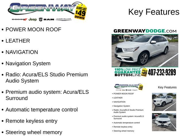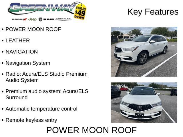POWER MOON ROOF, LEATHER, NAVIGATION, Ebony Leather, Adaptive suspension, Apple CarPlay/Android Auto, Automatic temperature control, Brake assist, Electronic Stability Control, Exterior Parking Camera Rear, Four wheel independent suspension, Garage door transmitter: HomeLink, Heated Front Sport Seats, Lane Departure Warning System, Navigation System, Power Liftgate, Premium audio system: Acura/ELS Surround, Radio: Acura/ELS Studio Premium Audio System, Remote keyless entry, Steering wheel memory, Steering wheel mounted audio controls, Traction control, Turn signal indicator mirrors.