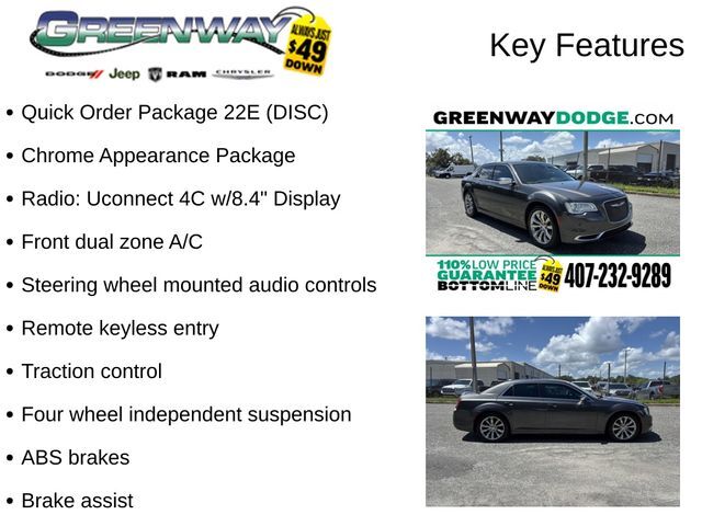 19/30 City/Highway MPG 20" x 8.0" Polished Aluminum Wheels, ABS brakes, Apple CarPlay/Android Auto, Auto-dimming Rear-View mirror, Brake assist, Chrome Appearance Package, Chrome Exterior Mirrors, Chrysler Badging, Cloth High-Back Bucket Seats, Day Light Opening Moldings, Electronic Stability Control, Exterior Parking Camera Rear, Four wheel independent suspension, Front dual zone A/C, Fully automatic headlights, Platinum Grille & Surround, Power Heated Mirrors, Quick Order Package 22E (DISC), Radio: Uconnect 4C w/8.4" Display, Remote keyless entry, Speed-Sensitive Wipers, Steering wheel mounted audio controls, Traction control. CARFAX One-Owner.