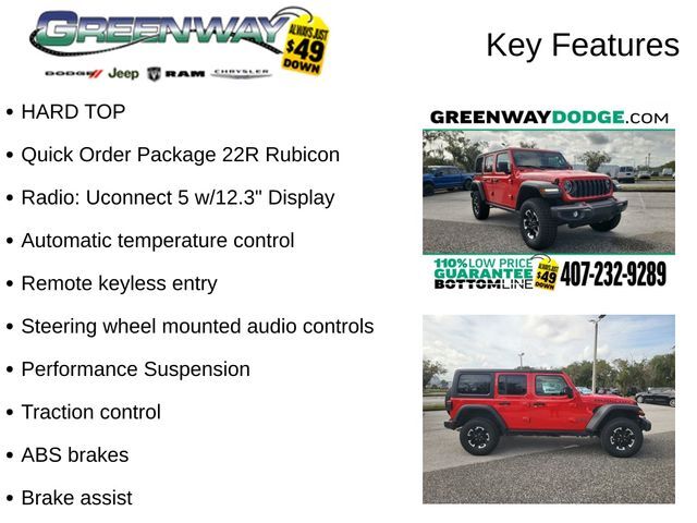 HARD TOP, ABS brakes, Apple CarPlay/Android Auto, Automatic temperature control, Brake assist, Class II Receiver Hitch, Cloth Low-Back Bucket Seats, Electronic Stability Control, Front fog lights, Fully automatic headlights, ParkView Rear Back-Up Camera, Performance Suspension, Quick Order Package 22R Rubicon, Radio: Uconnect 5 w/12.3" Display, Remote keyless entry, Steering wheel mounted audio controls, Stop-Start Dual Battery System, Traction control, Wheels: 17" x 7.5" Machined w/Black Pockets. CARFAX One-Owner.