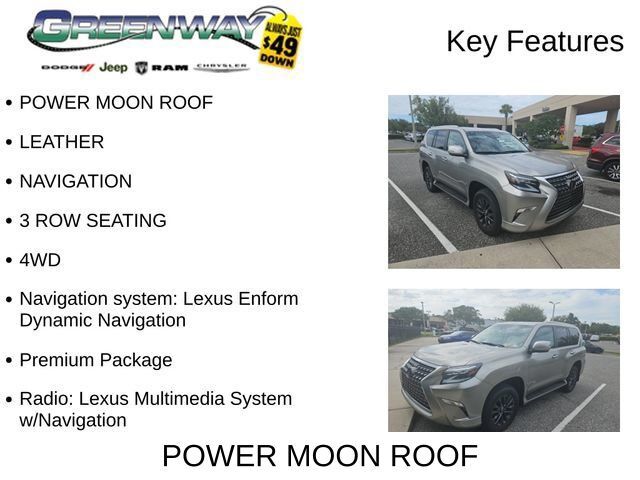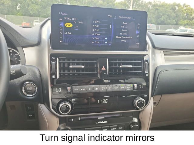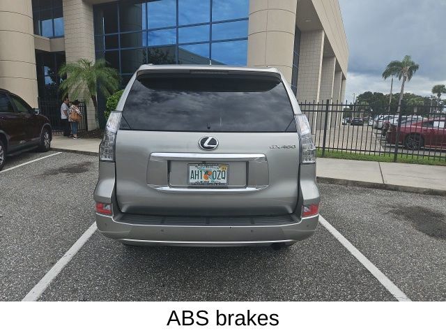 Dual front airbags, front seat mounted side-impact airbags, dual roll-sensing front/rear head curtain side-impact airbags, second row outbound seat mounted side-impact airbags, dual front seat knee airbags, four-wheel disc brakes with anti-lock, electronic brake force distribution, active traction control, vehicle stability control, downhill assist control, hill-start assist control, Smart Stop technology, TORSEN limited-slip center differential with electronic locking feature, Lexus Enform Safety Connect, remote keyless entry, automatic power door locks, SmartAccess system, vehicle security system, LED low-beam headlamps, LED daytime running lights, automatic headlamps, backup camera, first aid kit, HomeLink electronic programmable garage door opener, Bluetooth hands free phone system, trailer sway control, and tire pressure monitoring system. GX 460 Premium adds intuitive park assist, LED foglamps, navigation system, rain-sensing windshield wipers, and windshield de-icer. GX 460 Luxury adds blind spot monitor with cross traffic alert, navigation system, backup camera, and emergency assist kit.