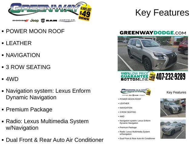 The Lexus GX 460 is a full-capability luxury SUV that’s as at home on the trail as it is in the city or suburbs. The GX 460 carries up to seven in renowned Lexus comfort. Offered in Standard, Premium and Luxury trim levels, the Lexus signature spindle grille gives the GX 460 a distinctive, standout style. For 2017, the new available Sport Design Package puts an extra accent on that design with special details such as an exclusive front bumper, rear bumper spoiler, special exhaust tailpipe tip, a redesigned side mirror case and gray metallic paint on unique 18-inch split-six spoke alloy wheels.