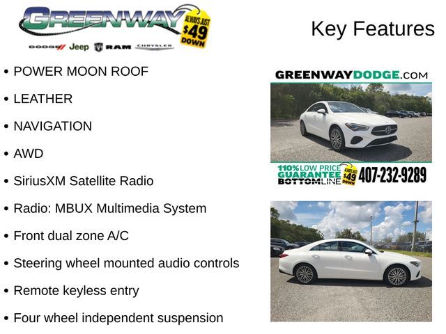 Available in CLA250 and CLA250 4MATIC models, power is generated by 2.0L turbocharged four-cylinder powerplant. Torque for both models is communicated to the street through a seven-speed DCT (dual-clutch transmission) automatic.