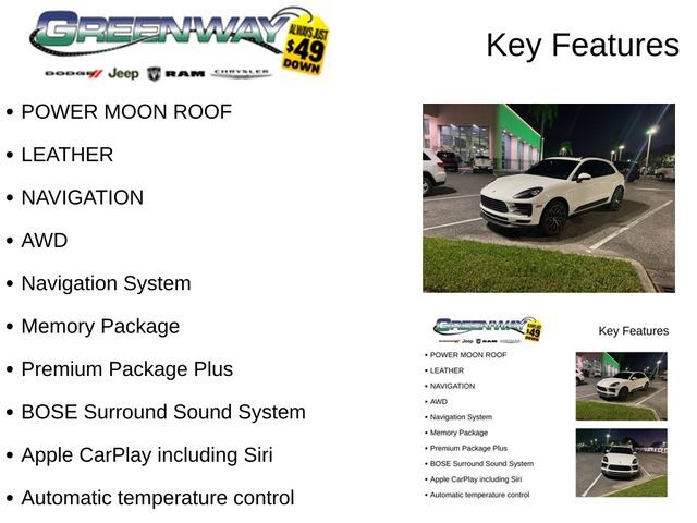 POWER MOON ROOF, LEATHER, NAVIGATION, AWD, 14-Way Power Seats, Alloy wheels, Apple CarPlay including Siri, Automatic temperature control, Automatically Dimming Exterior Mirrors, BOSE Surround Sound System, Brake assist, Electronic Stability Control, Exterior Parking Camera Rear, Four wheel independent suspension, Front & Rear Heated Seats, Front Seat Ventilation, Fully automatic headlights, Memory Package, Navigation System, Panoramic Roof System, Porsche Communication Management, Porsche Dynamic Light System Plus (PDLS ), Porsche Entry & Drive, Power Liftgate, Premium Package Plus, Rain sensing wipers, Remote keyless entry, Steering wheel mounted audio controls.