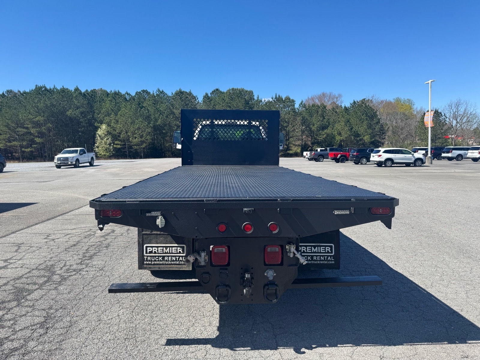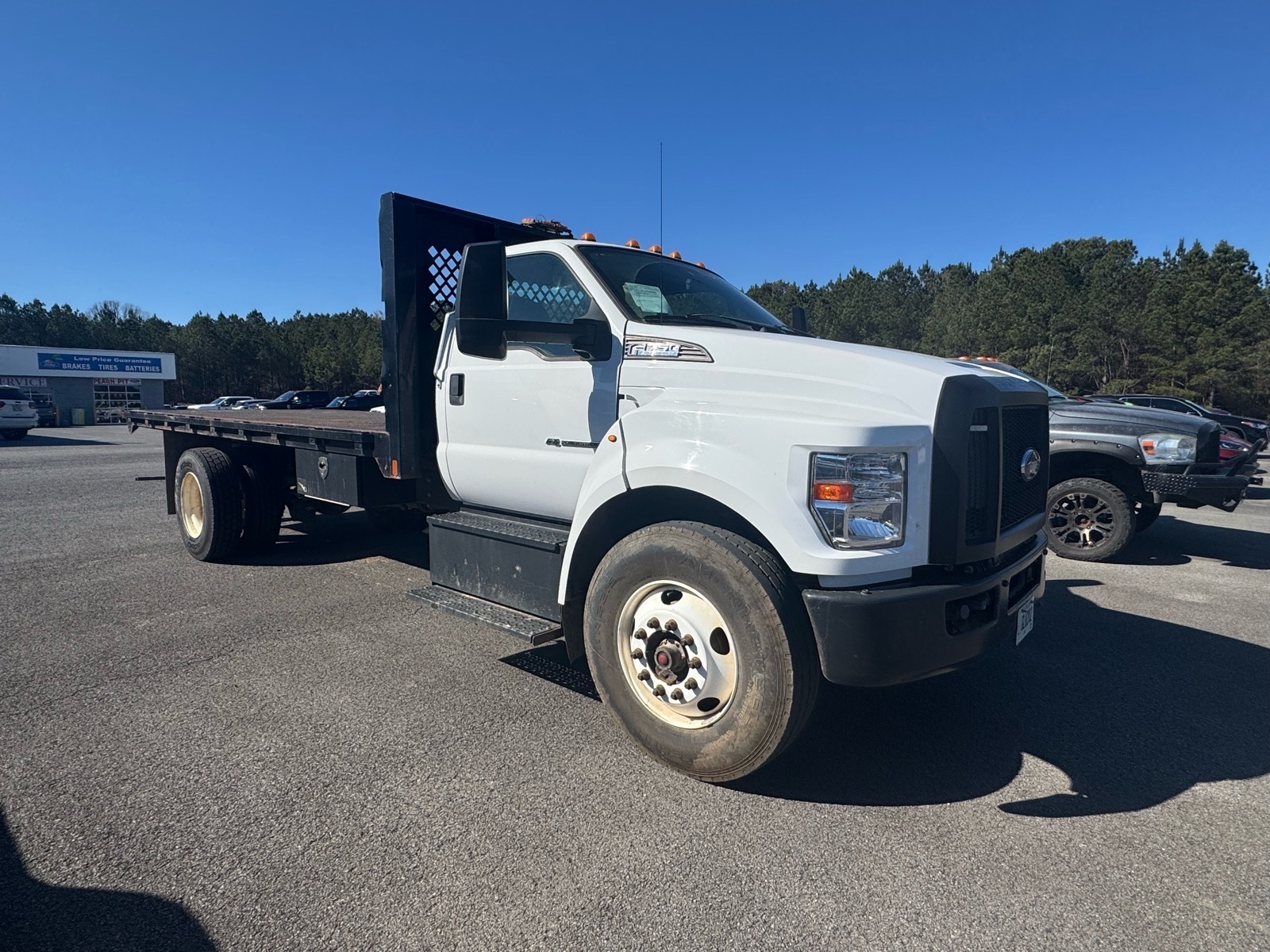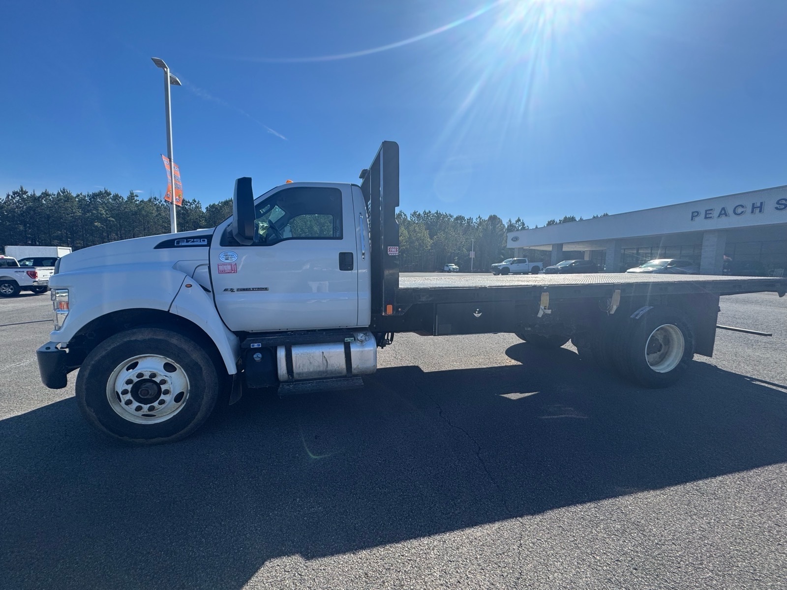 Flatbed, Drivers Seat Mounted Armrest, Dual rear wheels, Engine Exhaust Brake, Floor Covering - Black Vinyl, Four Body Builder Switches - Mounted in Center Instrument Panel, Front reading lights, Intelligent Oil Life Monitor, Lights - Roof Marker/Clearance - Amber Lenses, 5 Lights, Speed-Sensitive Wipers, Steering Wheel - Black PVC w/Integral Cruise Control Switches, includes Audio Controls, Tachometer, Telescoping steering wheel, Tilt steering wheel, Trip computer, Variably intermittent wipers, Wheel Seals, Front - Oil lubricated, SKF ScotSeal PlusXL Seals, Wheel Seals, Rear - Oil lubricated, SKF ScotSeal PlusXL Seals. Oxford White 2021 Ford F-750SD RWD 6-Speed Automatic V8