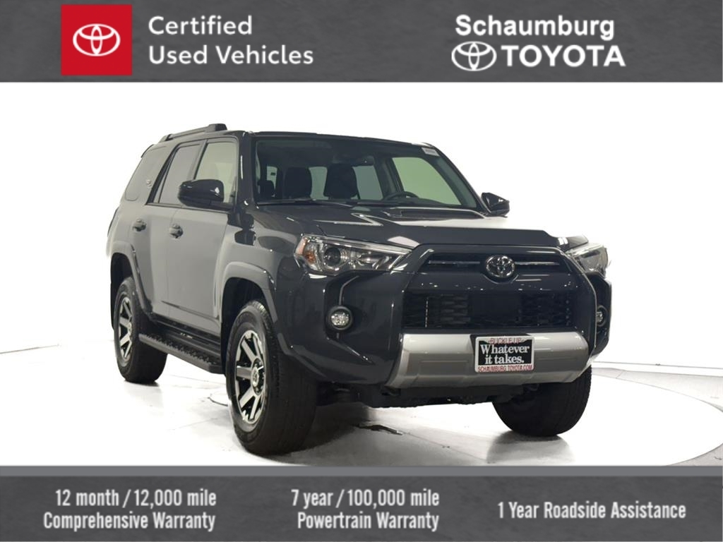 ** Adaptive Cruise Control, ** Alloy Wheels / Premium Wheels, ** Apple CarPlay/Android Auto, ** Automatic Emergency Braking, ** Backup Camera, ** Bluetooth, Hands-Free, ** Brake Assist, ** Cruise Control, ** Keyless Entry, ** Lane Departure Warning, ** Portable Audio Connection, ** Satellite Radio, ** Security System, ** Stability Control, ** Steering Wheel Controls, ** USB Port, 1-OWNER, 4WD, Black/Graphite w/Fabric Seat Trim.Odometer is 4387 miles below market average! CARFAX One-Owner. Clean CARFAX. Certified. Underground 2024 Toyota 4Runner 4D Sport Utility TRD Off-Road 4.0L V6 DOHC 24V 5-Speed with ECT 4WDToyota Gold Certified Details: * Roadside Assistance for 7 Year / 100,000 Mile. Standard New-Car Financing Rates Available. Warranty honored at over 1,400 Toyota dealers in the continental U.S. & Canada. Trade-ins accepted. Trouble-free handling of your transaction, including DMV paperwork * Powertrain Limited Warranty: 84 Month/100,000 Mile (whichever comes first) from TCUV purchase date * Warranty Deductible: $0 * Vehicle History * Transferable Warranty * Roadside Assistance * Limited Warranty: 12 Month/12,000 Mile Limited Comprehensive Warranty: 12 Month/12,000 Mile (whichever comes first) from certified purchase date * 160 Point InspectionSchaumburg Toyota - WHATEVER IT TAKES! - Come See For Yourself Why Today!