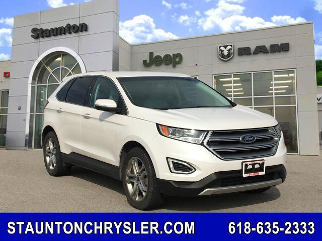 Recent Arrival! 2015 Ford Edge Titanium WhiteBackup Camera, Bluetooth Hands-Free, Call (618) 635-2333 to get this Great Deal!, Heated Seats, Leather Seats, Premium Audio, Premium Wheels, Reverse Sensing, Push Button Start, Telescopic Steering Wheel, Ford Sync.6-Speed AutomaticWith some Features and Options Like 12 Speakers, 3.16 Axle Ratio, 4-Wheel Disc Brakes, ABS brakes, Air Conditioning, AM/FM radio: SiriusXM, AM/FM Stereo w/Single CD Player, Auto-dimming Rear-View mirror, Automatic temperature control, Brake assist, Bumpers: body-color, CD player, Compass, Delay-off headlights, Driver door bin, Driver vanity mirror, Dual front impact airbags, Dual front side impact airbags, Electronic Stability Control, Emergency communication system, Exterior Parking Camera Rear, Four wheel independent suspension, Front anti-roll bar, Front Bucket Seats, Front Center Armrest w/Storage, Front dual zone A/C, Front reading lights, Fully automatic headlights, Garage door transmitter, Heated door mirrors, Heated front seats, Illuminated entry, Knee airbag, Leather Shift Knob, Leather-Trimmed Heated Sport Bucket Seats, Low tire pressure warning, Memory seat, MP3 decoder, Occupant sensing airbag, Outside temperature display, Overhead airbag, Overhead console, Panic alarm, Passenger door bin, Passenger vanity mirror, Power door mirrors, Power driver seat, Power Liftgate, Power passenger seat, Power steering, Power windows, Premium audio system: Sony, Rear anti-roll bar, Rear Parking Sensors, Rear reading lights, Rear seat center armrest, Rear window defroster, Rear window wiper, Remote keyless entry, Security system, SiriusXM Radio, Speed control, Speed-Sensitive Wipers, Split folding rear seat, Spoiler, Steering wheel mounted audio controls, SYNC w/MyFord Touch, Tachometer, Telescoping steering wheel, Tilt steering wheel, Traction control, Trip computer, Turn signal indicator mirrors, Variably intermittent wipers, and Wheels: 19 Aluminum Premium Painted Luster Nickel.20/30 City/Highway MPGAwards: * 2015 IIHS Top Safety Pick * 2015 KBB.com Brand Image AwardsStaunton Chrysler Jeep Ram serving Drivers in the Staunton IL, Gillespie, Litchfield IL, Edwardsville & Glen Carbon Areas, Your Source for New,Used, Preowned and Certified Chrysler, Dodge, Jeep & RAM Models is our Dealership: Staunton Chrysler Dodge Jeep Ram You and your family and friends are all invited to stop in to Staunton Chrysler Dodge Jeep Ram of Staunton IL, W