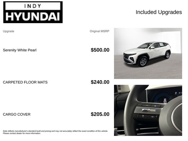 $1,450 off MSRP! White Pearl 2026 Hyundai Tucson SE AWD. At Indy Hyundai in Indianapolis, IN, we offer a full lineup of new Hyundai vehicles for sale, including the latest Hyundai SUVs, sedans, and hybrid models. This new YEAR Hyundai MODEL TRIM delivers advanced technology, fuel efficiency, and modern design backed by Hyundai's industry-leading warranty. Proudly serving Indianapolis, Carmel, Fishers, Greenwood, and surrounding Indiana areas, we make it easy to upgrade into a new Hyundai. If you're searching for a new Hyundai near you or the best Hyundai deals in Indianapolis, contact Indy Hyundai today to confirm availability and schedule your test drive. AWD 8-Speed Automatic with SHIFTRONIC 2.5L I4 DGI DOHC 16V LEV3-SULEV30 187hp 24/30 City/Highway MPG Vehicle description, options, price and trim may not be accurate due to automated processes. Bob Rohrmans Indy Hyundai proudly selling and servicing New, Used, Pre-owned and certified vehicles in and around Indianapolis Indiana, and surrounding central Indiana. We stock all makes and models of used SUVs, cars and trucks. We even offer budget vehicles under $5k. Hyundai, Kia, Honda, GM, Chrysler, Ford, Toyota, Chevrolet, Buick, GMC, Dodge, Ram, Acura, Subaru, Lexus. Price includes: $1,450 - Exp. 04/30/2026