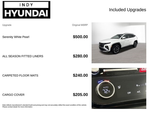 $1,450 off MSRP! White Pearl 2026 Hyundai Tucson SEL Back up Camera, Best place to buy a used car, Bluetooth, Buy a used car, New Hyundai dealership near me, New Hyundai for sale near me, Used car deals this weekend, Used car for sale, Used car special, Used car specials, Used cars near Indianapolis, Used cars near me, Tucson SEL, 4D Sport Utility, 2.5L I4 DGI DOHC 16V LEV3-SULEV30 187hp, 8-Speed Automatic with SHIFTRONIC, FWD, White Pearl, Black Cloth. At Indy Hyundai in Indianapolis, IN, we offer a full lineup of new Hyundai vehicles for sale, including the latest Hyundai SUVs, sedans, and hybrid models. This new YEAR Hyundai MODEL TRIM delivers advanced technology, fuel efficiency, and modern design backed by Hyundai's industry-leading warranty. Proudly serving Indianapolis, Carmel, Fishers, Greenwood, and surrounding Indiana areas, we make it easy to upgrade into a new Hyundai. If you're searching for a new Hyundai near you or the best Hyundai deals in Indianapolis, contact Indy Hyundai today to confirm availability and schedule your test drive. FWD 8-Speed Automatic with SHIFTRONIC 2.5L I4 DGI DOHC 16V LEV3-SULEV30 187hp 25/33 City/Highway MPG Vehicle description, options, price and trim may not be accurate due to automated processes. Bob Rohrmans Indy Hyundai proudly selling and servicing New, Used, Pre-owned and certified vehicles in and around Indianapolis Indiana, and surrounding central Indiana. We stock all makes and models of used SUVs, cars and trucks. We even offer budget vehicles under $5k. Hyundai, Kia, Honda, GM, Chrysler, Ford, Toyota, Chevrolet, Buick, GMC, Dodge, Ram, Acura, Subaru, Lexus. Price includes: $1,450 - Exp. 04/30/2026