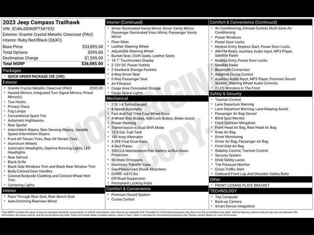 Back up Camera, Best place to buy a used car, Bluetooth, Buy a used car, New Hyundai dealership near me, New Hyundai for sale near me, Used car deals this weekend, Used car for sale, Used car special, Used car specials, Used cars near Indianapolis, Used cars near me, Compass Trailhawk, 4D Sport Utility, 2.0L I4 DOHC, 8-Speed Automatic, 4WD, Granite Crystal Metallic Clearcoat, Ruby Red/Black Cloth. CARFAX One-Owner. Granite Crystal Metallic Clearcoat 2023 Jeep Compass 4WD Trailhawk 2.0L I4 DOHC Discover Your Perfect Vehicle at Bob Rohrman's Indy Hyundai - Indianapolis' Leading Dealership for New, Used, and Certified Pre-Owned Cars, SUVs, and Trucks Looking for your next car At Bob Rohrman's Indy Hyundai, we offer an unmatched selection of new, used, and certified pre-owned vehicles in Indianapolis, Indiana. Whether you're after a spacious SUV, a rugged truck, or an efficient car, we've got all makes and models to suit your lifestyle. Shopping with us is easy-our team is dedicated to helping you find the perfect vehicle and making your car-buying experience smooth and hassle-free. With a great inventory and competitive pricing, we proudly serve customers throughout central Indiana. Stop by today for the best deals in town or explore our online inventory now.Disclaimer: Vehicle descriptions, options, and trim levels may not be accurate due to automated processes.