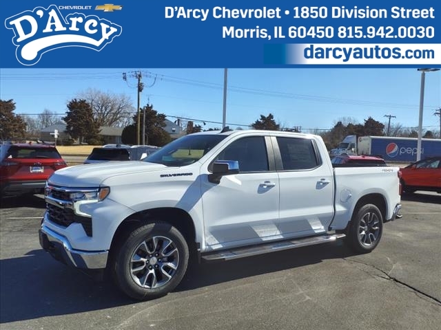 Summit White 2025 Chevrolet Silverado 1500 LT LT1 4WD 10-Speed Automatic EcoTec3 5.3L V810-Speed Automatic, 4WD, Black Leather.Discover the D'Arcy Difference! We care - we are here and we are ready to help! Stop by www.darcyautos.com today to see up to date information, including showroom and service hours, and how to make an appointment or schedule delivery.D'Arcy Motors has been serving Joliet and its surrounding communities for over 25 years. Our business philosophy, which is to sell cars one car at a time and to make the guest the most important part of the process, has remained the same since 1991. Putting our guests first means being a good corporate citizen and investing back into our community. We look forward to serving you! Price includes: $1000 - Bonus Cash. Exp. 11/03/2025 $3250 - Customer Cash. Exp. 11/03/2025 Price includes dealer added accessories.