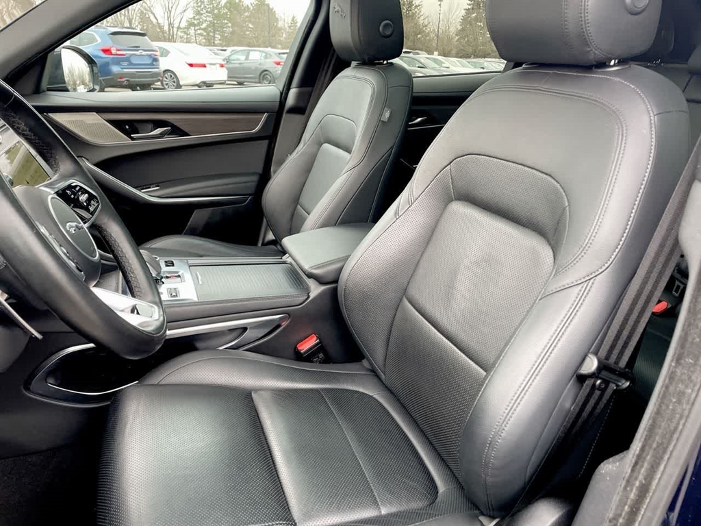 Inside the passenger compartment, the 'Sports Command' driving position provides authoritative, confidence-inspiring outward visibility, while retaining the Jaguar-specific sports car feel; the dramatic curve of the front door top is incorporated into the dash fascia enhancing the cockpit-like feel. The vehicle's available leather sports seats are shaped to provide exceptional comfort and support; they are available with 14 different adjustments plus heating and cooling functions. A range of contemporary trim options are also available, including authentic metal finishes such as Meshed Aluminum and beautiful crafted veneers such as Satin Grey Ash.