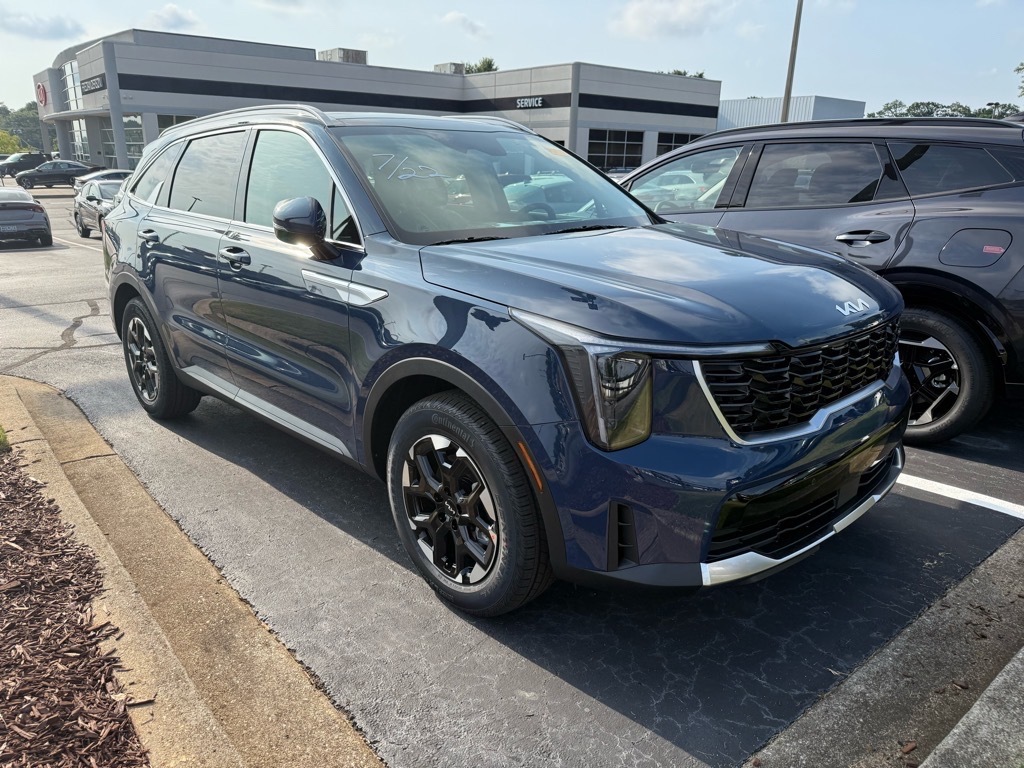 2025 Kia Sorento S Midnight Lake Blue 3rd row seats: split-bench, 4-Wheel Disc Brakes, 6 Speakers, ABS brakes, Air Conditioning, Alloy wheels, AM/FM radio: SiriusXM, Apple CarPlay & Android Auto, Auto High-beam Headlights, Auto-Dimming Mirror w/HomeLink, Automatic temperature control, Brake assist, Bumpers: body-color, Cargo Tray, Carpeted Floor Mats, Delay-off headlights, Driver door bin, Driver vanity mirror, Dual front impact airbags, Dual front side impact airbags, Electronic Stability Control, Emergency communication system: 911 Connect, Exterior Parking Camera Rear, Four wheel independent suspension, Front anti-roll bar, Front Bucket Seats, Front Center Armrest, Front dual zone A/C, Front reading lights, Fully automatic headlights, Heated door mirrors, Heated Front Bucket Seats, Heated front seats, Illuminated entry, Knee airbag, Leather Shift Knob, Leather steering wheel, LED Interior Lighting, Low tire pressure warning, Navigation System, Occupant sensing airbag, Outside temperature display, Overhead airbag, Overhead console, Panic alarm, Panoramic Power Sunroof w/Power Sunshade, Panoramic Sunroof Package, Passenger door bin, Passenger vanity mirror, Power door mirrors, Power driver seat, Power steering, Power windows, Radio data system, Radio: AM/FM Standard Sound System, Rear anti-roll bar, Rear reading lights, Rear seat center armrest, Rear side impact airbag, Rear window defroster, Rear window wiper, Remote keyless entry, Security system, Speed control, Speed-sensing steering, Split folding rear seat, Spoiler, Steering wheel mounted audio controls, SynTex Artificial Leather Seat Trim, Tachometer, Telescoping steering wheel, Tilt steering wheel, Traction control, Trip computer, Turn signal indicator mirrors, Variably intermittent wipers, Wheels: 18Gloss Black Alloy. 4D Sport Utility FWD 8-Speed Automatic 2.5L I4 DGI DOHC 16V LEV3-SULEV30 191hp 23/31 City/Highway MPG 23/31 City/Highway MPG Thank you for checking out our website at www.KiaOfGreer.com where