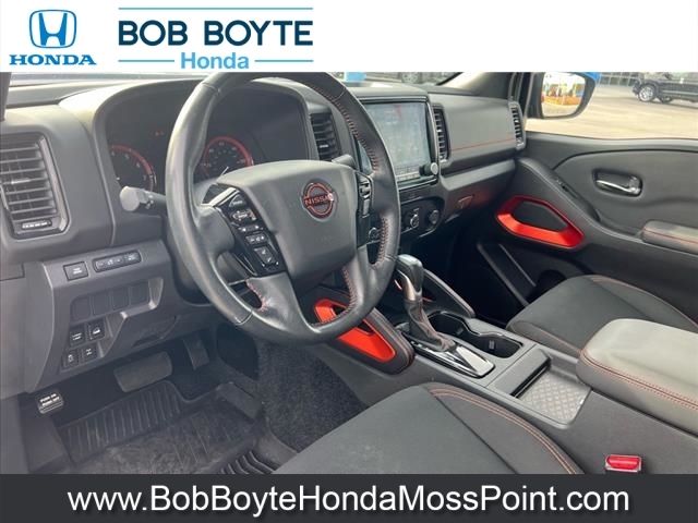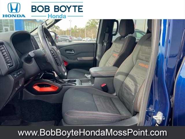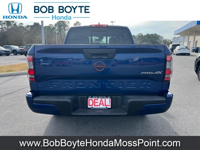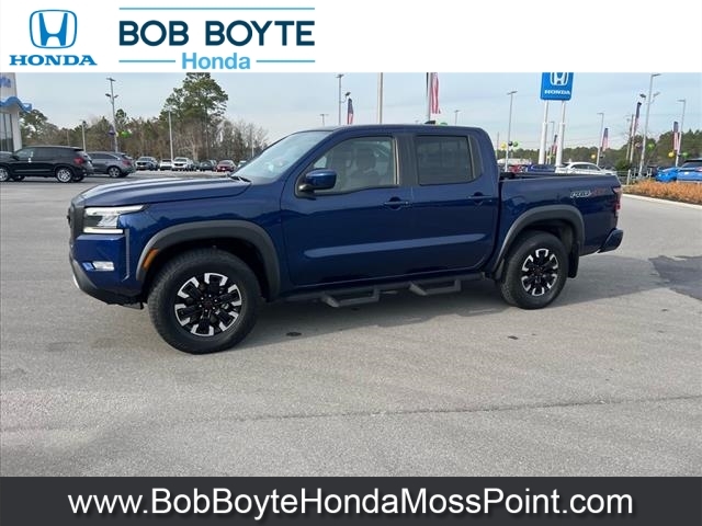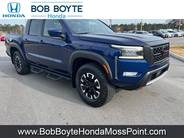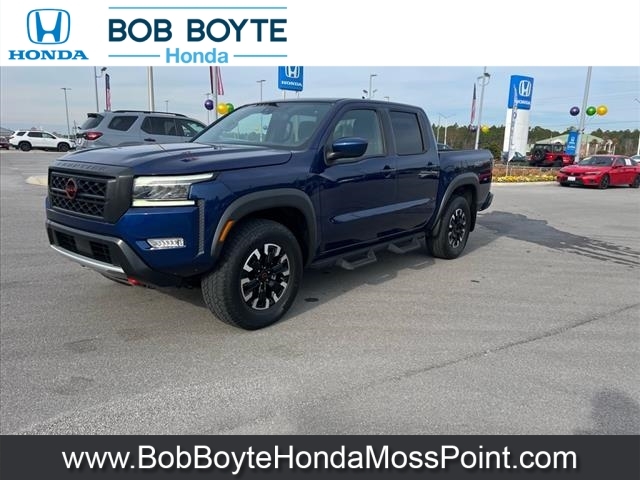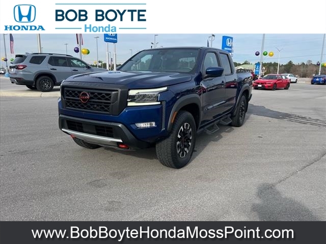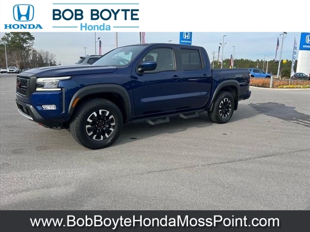 2022 Nissan Frontier PRO-4X Deep Blue Pearl 4D Crew Cab 4WD 3.8L DI DOHC 24V V6 9-Speed Automatic CARFAX One-Owner. Never A Rental, Local Trade, Used Car Dealer Pascagoula MS, This vehicles oil change history, as reported to CARFAX, follows the manufacturers recommendation, Accident Reported: Minor Damage, Minor damage is usually cosmetic, including dents or scratches to the vehicle body, Used Car Dealer Near Gulfport MS, Alloy wheels, Automatic temperature control, Electronic Stability Control, Emergency communication system: NissanConnect Services, Fully automatic headlights, Illuminated entry, Navigation system: Nissan Navigation with Voice Recognition, Off-Road Protection Package, Panic alarm, Power driver seat, PRO Embroidered Premium Cloth Seat Trim, Radio: SXM/AM/FM/AUX/USB Audio System w/6 Speakers, Remote keyless entry, Security system, Speed control, Steering wheel mounted audio controls. This vehicle has been through an extensive multi-point inspection by an ASE Certified Technician. All necessary services have been done for the appropriate mileage interval as deemed necessary. We have also reconditioned this vehicle inside and out to provide you with as near a new car experience as can be expected from a vehicle of this year and mileage. Buy with confidence. Family-owned and locally operated. Get Pre-Approved at https://www.bobboytehondamosspoint.com/get-pre-qualified.html Free Vehicle History report. Large Mississippi Gulf Coast Used Car Super Store serving residents of Pascagoula, Biloxi, Gulfport, DIberville, MS, as well as Mobile, AL and the entire Gulf Coast. Call Bob Boyte Honda Moss Point today at 228-202-0200.