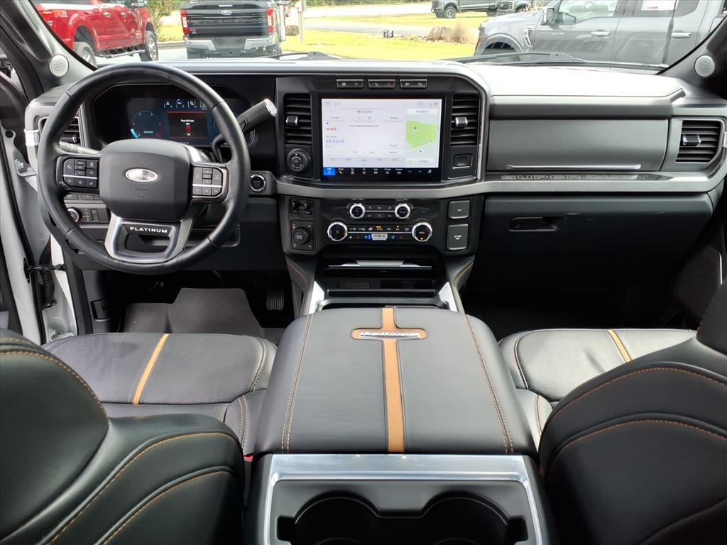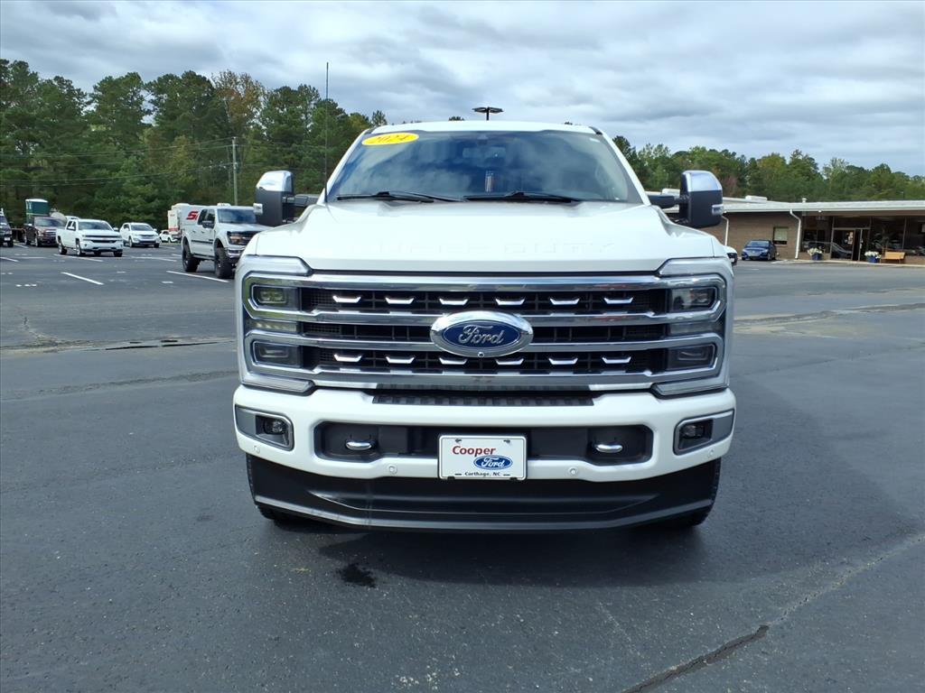 CARFAX One-Owner. Clean CARFAX. Star White Metallic Tri-Coat 2024 Ford F-250SD Platinum 4WD 10-Speed Automatic Power Stroke 6.7L V8 DI 32V OHV Turbodiesel Moonroof/Sunroof, 4WD, 4-Wheel Disc Brakes, ABS brakes, Adjustable pedals, Air Conditioning, Alloy wheels, AM/FM radio: SiriusXM with 360L, Auto High-beam Headlights, Auto tilt-away steering wheel, Auto-dimming Rear-View mirror, Automatic temperature control, Brake assist, Compass, Delay-off headlights, Driver door bin, Driver vanity mirror, Dual front impact airbags, Dual front side impact airbags, Electronic Stability Control, Emergency communication system: SYNC 4 911 Assist, Engine Block Heater, Exterior Parking Camera Rear, F-250 >10K GVWR Package, Flow-Through Console, Front anti-roll bar, Front Bucket Seats, Front Center Armrest, Front dual zone A/C, Front fog lights, Front reading lights, Fully automatic headlights, FX4 Off-Road Package, Garage door transmitter, Heated door mirrors, Heated front seats, Heated rear seats, Heated steering wheel, High Capacity 11.6 Axle Upgrade Package, Hill Descent Control, Illuminated entry, Leather steering wheel, Low tire pressure warning, Memory seat, Navigation system: Connected Navigation (includes complimentary 1-year trial), Off-Road Specifically Tuned Shock Absorbers, Order Code 703A, Outside temperature display, Overhead airbag, Overhead console, Panic alarm, Passenger door bin, Passenger vanity mirror, Pedal memory, Power door mirrors, Power driver seat, Power passenger seat, Power steering, Power windows, Radio: B&O Unleashed Sound System by Bang & Olufsen, Rain sensing wipers, Rear reading lights, Rear seat center armrest, Rear step bumper, Rear window defroster, Remote keyless entry, Security system, SiriusXM Radio w/360L, Speed control, Split folding rear seat, Steering wheel memory, Steering wheel mounted audio controls, SYNC 4 w/Enhanced Voice Recognition, Tachometer, Telescoping steering wheel, Tilt steering wheel, Traction control, Trip computer, Turn signal indicator mirrors, Twin Panel Power Moonroof, Unique FX4 Off-Road Box Decal, Variably intermittent wipers, Ventilated front seats.