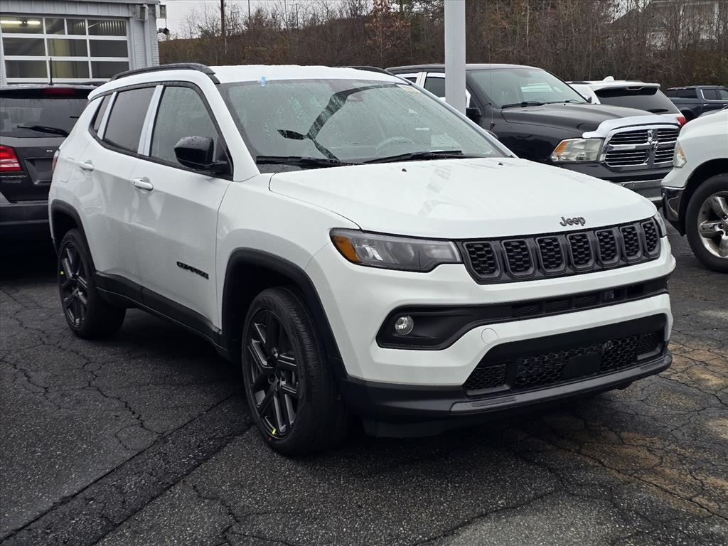 Bright White Clearcoat 2026 Jeep Compass Latitude 4WD 8-Speed Automatic 2.0L I4 DOHC INFORMATION ABOUT THIS VEHICLE AND ITS FEATURES:, 4WD. Quick Order Package 29N Altitude (10.1Touchscreen Display, Altitude Special Edition, Black Day Light Opening Moldings, Gloss Black Surround/Neutral Gray Rings, Neutral Gray Exterior Badging, Piano Black Interior Accents, Sliding Sun Visors with Illuminated Mirrors, and Wheels: 18x 7Gloss Black Painted Aluminum), 4WD, 17x 7Aluminum Wheels, 3.73 Final Drive Ratio, 4-Wheel Disc Brakes, 4G LTE Wi-Fi Hot Spot, 6 Speakers, ABS brakes, Air Conditioning, AM/FM radio: SiriusXM, Auto High-beam Headlights, Automatic temperature control, Bluetooth Handsfree Phone and Audio, Brake assist, Bumpers: body-color, Compass, Delay-off headlights, Driver door bin, Driver vanity mirror, Dual front impact airbags, Dual front side impact airbags, Electronic Stability Control, Emergency communication system: SiriusXM Guardian, Four wheel independent suspension, Front anti-roll bar, Front Bucket Seats, Front Center Armrest w/Storage, Front fog lights, Front reading lights, Fully automatic headlights, Global Telematics Box Module, Heated door mirrors, Heated front seats, Heated steering wheel, Illuminated entry, Knee airbag, Leather Shift Knob, Leather steering wheel, Low tire pressure warning, MyFlexCare Service Plan, Occupant sensing airbag, Outside temperature display, Overhead airbag, Overhead console, Panic alarm, ParkView Rear Back-Up Camera, Passenger door bin, Passenger vanity mirror, Power door mirrors, Power steering, Power windows, Premium audio system: UConnect 5, Premium Cloth/Vinyl Bucket Seats, Radio: Uconnect 5 with 8.4Display, Rear anti-roll bar, Rear seat center armrest, Rear window defroster, Rear window wiper, Remote keyless entry, Security system, SiriusXM Satellite Radio, Speed control, Split folding rear seat, Spoiler, Steering wheel mounted audio controls, Tachometer, Telescoping steering wheel, Tilt steering wheel, Traction control, Trip computer, Variably intermittent wipers, and Wheels: 19x 7.5Aluminum Painted. 23/31 City/Highway MPG Price includes: $1000 - 2026 National Retail Bonus Cash . Exp. 02/02/2026