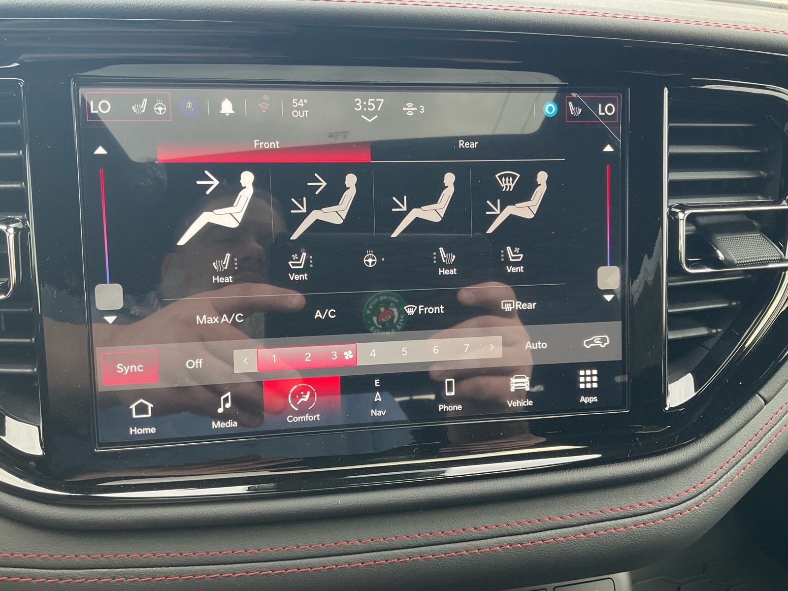 Inside the refreshed passenger cabin, new appointments include a hand-wrapped dashboard with live silver accent stitch, SRT flat-bottom performance steering wheel with standard paddle shift, heated and ventilated front and heated second-row captain’s chairs with embossed SRT logos. Nappa leather with suede inserts and silver-stitched SRT logos are standard. Demonic Red Laguna leather interior with embossed SRT logos is optional.