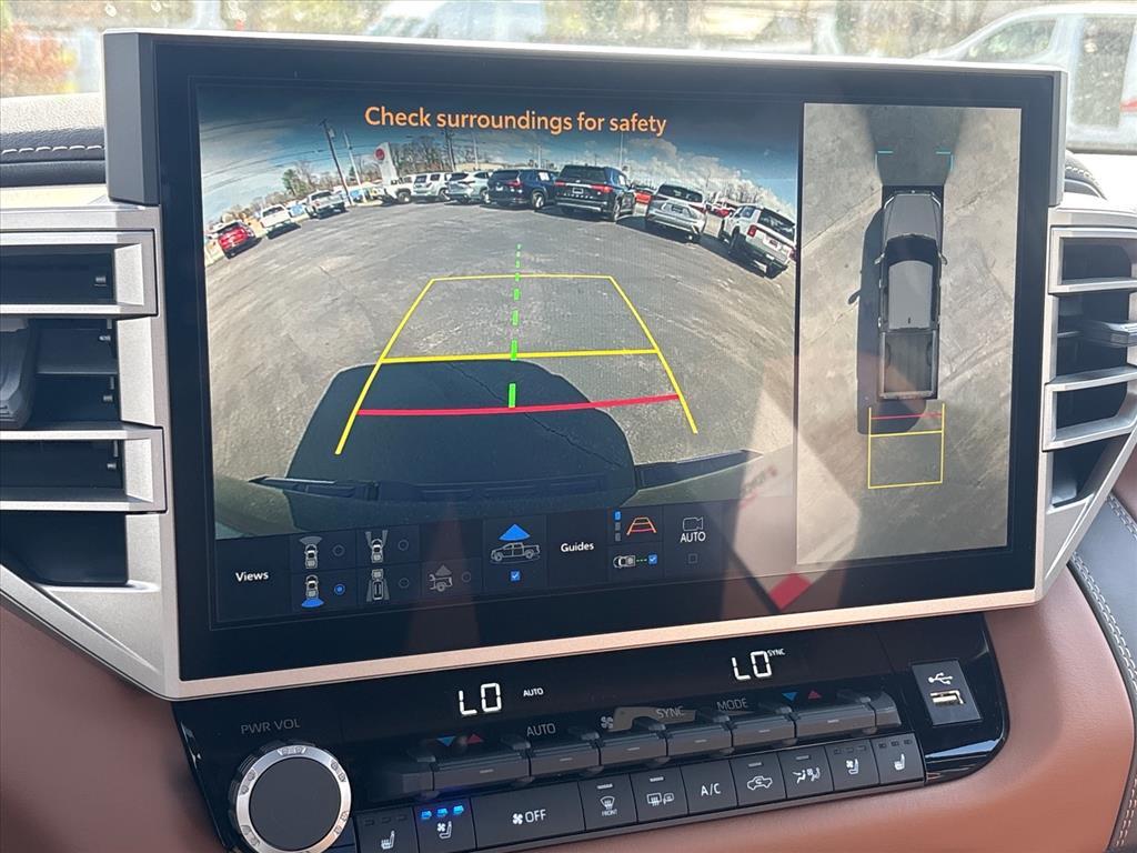 Dual front airbags, dual front seat side-impact airbags, dual front seat knee airbags, dual roll-sensing side curtain airbags, four-wheel disc brakes with anti-lock, brake assist, electronic brake force distribution, smart stop technology, traction control, vehicle stability control, automatic limited slip differential, pre-collision system with pedestrian protection, lane departure alert, sway warning system, automatic high beams, dynamic radar cruise control, daytime running lights, automatic power door locks, remote keyless entry, trailer sway control, anti theft system, engine immobilizer, and tire pressure monitoring system. SR5 Double Cab adds fog lights. TRD Double Cab adds navigation system. Limited Double Cab adds Bluetooth hands-free phone system and integrated trailer brake controller. Platinum CrewMax adds front and rear parking assist sonar system, blind spot monitor, and rear cross traffic alert.