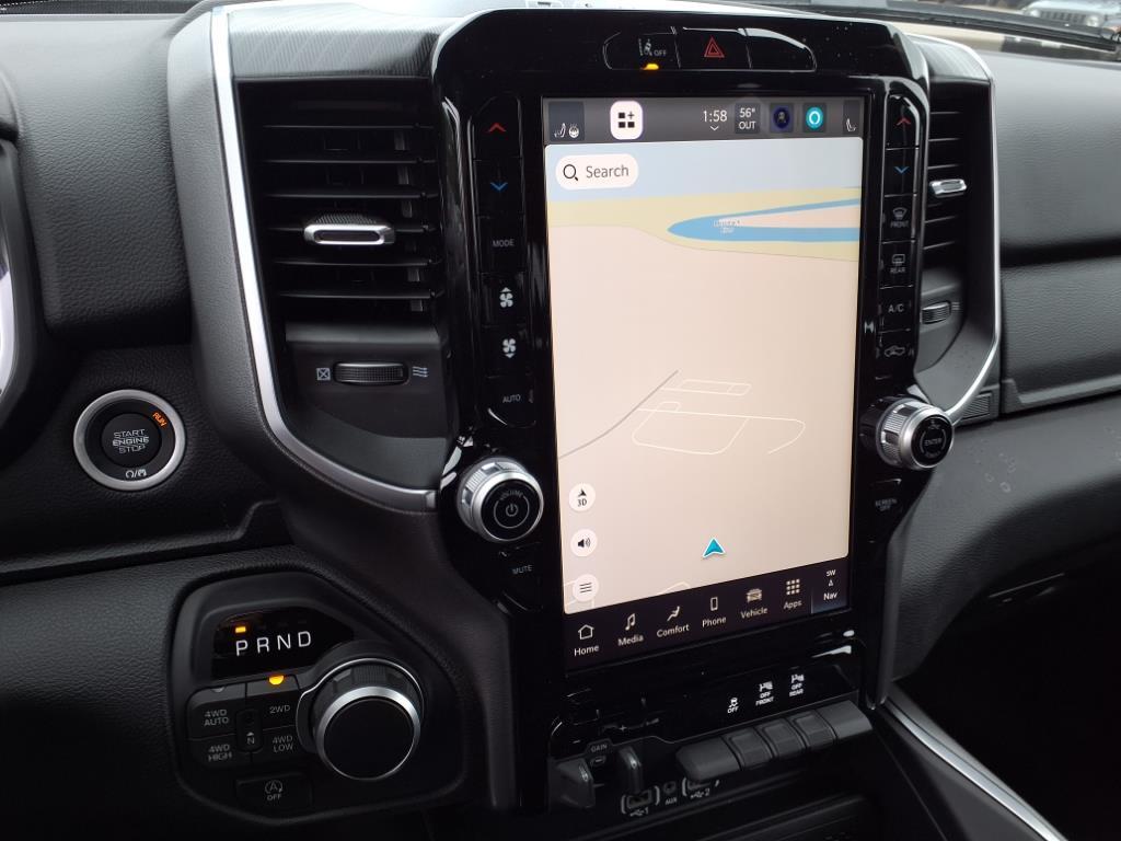 Vehicle equipped with: Big Horn Level 2 Equipment Group (115V Auxiliary Power Outlet, 115V Auxiliary Rear Power Outlet, 12 Touchscreen Display, 2nd Row In Floor Storage Bins, 400W Inverter, 4G LTE Wi-Fi Hot Spot, 9 Amplified Speakers w/Subwoofer, Air Conditioning ATC w/Dual Zone Control, Apple CarPlay, Auto Power-Folding Mirrors, Auto-Dimming Exterior Driver Mirror, Auto-Dimming Rear-View Mirror, Black Exterior Mirrors, Black Premium Power Mirrors, Cluster 7.0 TFT Color Display, Configurable Drive Mode, Connected Travel & Traffic Services, Connectivity - US/Canada, Convex Wide-Angle Exterior Mirror Insert, Exterior Mirrors Courtesy Lamps, Exterior Mirrors w/Heating Element, Exterior Mirrors w/Supplemental Signals, Glove Box Lamp, Google Android Auto, GPS Antenna Input, GPS Navigation, HD Radio, Heated Front Seats, Heated Steering Wheel, Integrated Voice Command w/Bluetooth, Leather Wrapped Steering Wheel, LED Dome Lamp w/On/Off Switch, LED Footwell Lighting, Media Hub w/2 Charge Only USBs, Overhead LED Lamps, Power 2-Way Driver Lumbar Adjust, Power Adjust 8-Way Driver Seat, Power Adjustable Pedals, Premium Overhead Console, Radio: Uconnect 5 Nav w/12.0 Display, Rear Power Sliding Window, Rear Window Defroster, Remote Tailgate Release, Security Alarm, SiriusXM w/360L, Steering Wheel Mounted Audio Controls, Sun Visors w/Illuminated Vanity Mirrors, Universal Garage Door Opener, and USB Host Flip), Night Edition (3 Rear Seat Head Restraints, 4 Way Front Headrests, Accent Color Door Handles, Accent Color Premium Power Mirrors, Accent Color Tailgate Handle, Anti-Spin Differential Rear Axle, Black Exterior Truck Badging, Black Headlamp Bezels, Black Interior Accents, Black Painted Exterior Mirrors Caps, Black Tail Lamp Bezels, Body Color Front Bumper, Body Color Rear Bumper w/Step Pads, Bucket Seats, Deluxe Cloth Bucket Seats, Front Seat Back Map Pockets, Full Length Floor Console, Grille Black Surround Black Mesh, Manual Adjust 4-Way Front Passenger Seat, RAM Grille Badge