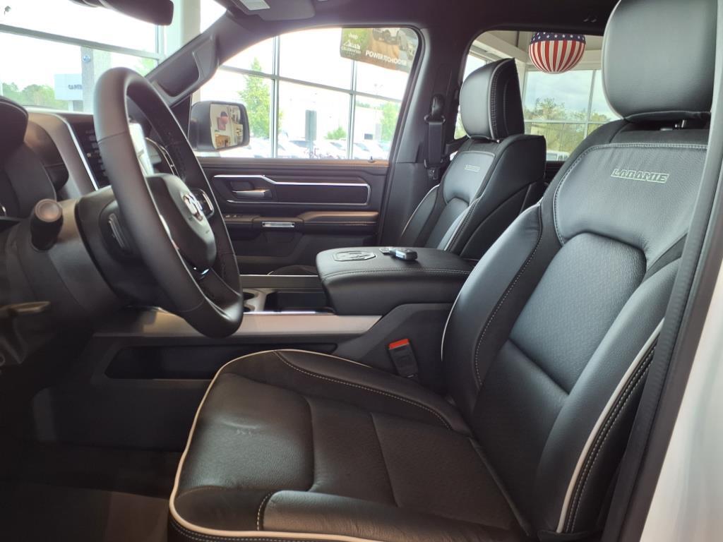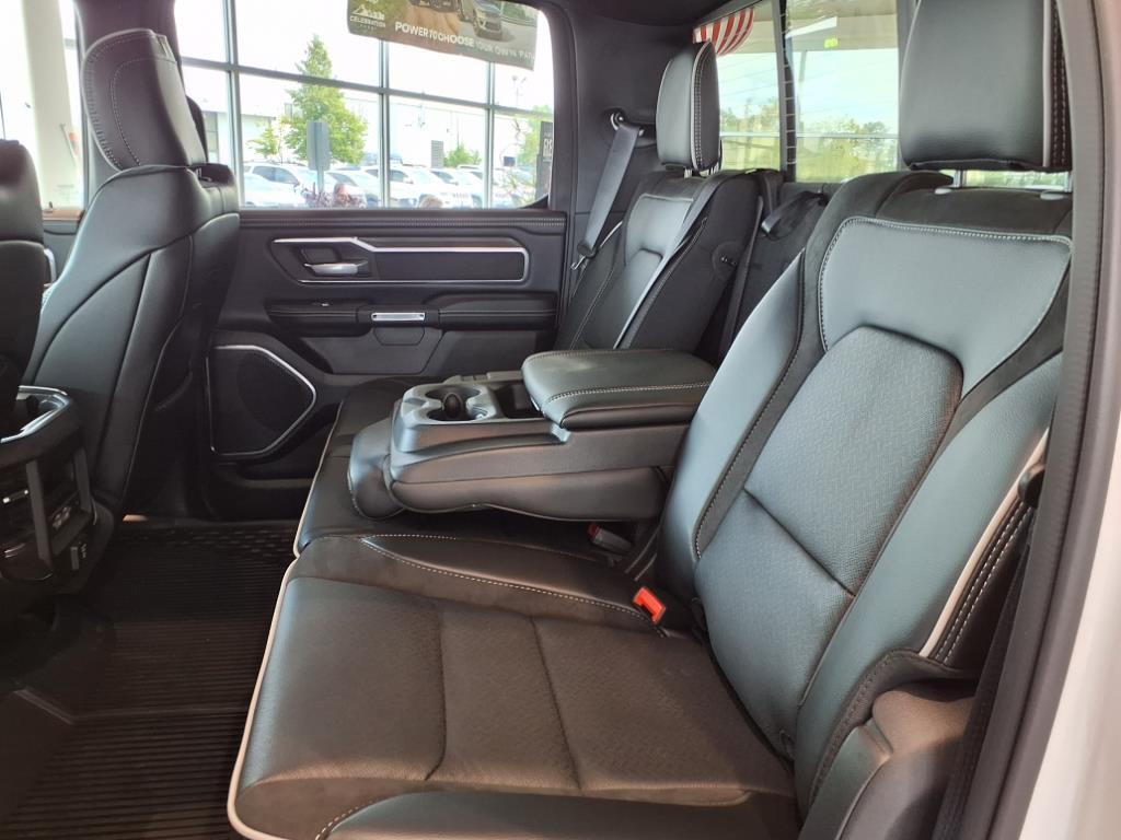 Vehicle equipped with: Bed Utility Group (MOPAR 4 Adjustable Cargo Tie-Down Hooks and MOPAR Spray In Bedliner), Laramie Level 1 Equipment Group (Rain Sensitive Windshield Wipers and Remote Tailgate Release), Quick Order Package 21H Laramie, Sport Appearance Package (#1 Seat Foam Cushion, 3 Rear Seat Head Restraints, 4 Way Front Headrests, Accent Color Premium Power Mirrors, Auto Power-Folding Mirrors, Auto-Dimming Exterior Driver Mirror, Black Interior Accents, Black Painted Exterior Mirrors Caps, Body Color Front Bumper, Body Color Rear Bumper w/Step Pads, Bridgestone Brand Tires, Bucket Seats, Center Console Parts Module, Convex Wide-Angle Exterior Mirror Insert, Driver Seat Memory, Exterior Mirrors Courtesy Lamps, Exterior Mirrors w/Heating Element, Exterior Mirrors w/Memory, Exterior Mirrors w/Supplemental Signals, Front Seat Back Map Pockets, Full Length Upgraded Floor Console, Grille Surround 3 Body Color Tex 2 Black, Heated Front Seats, Heated Second Row Seats, Heated Steering Wheel, Leather Trimmed Bucket Seats, Power 2-Way Driver Lumbar Adjust, Power 2-Way Passenger Lumbar Adjust, Power Adjust 8-Way Driver Seat, Power Adjust 8-Way Front Passenger Seat, RAM Grille Badge - Chrome, Rear 60/40 Folding Split Recline Seat, Sport Performance Hood, and Ventilated Front Seats), 10 Speakers, 4-Wheel Disc Brakes, 4G LTE Wi-Fi Hot Spot, ABS brakes, Air Conditioning, Alloy wheels, AM/FM radio: SiriusXM with 360L, Apple CarPlay, Apple CarPlay/Android Auto, Audio memory, Auto High-beam Headlights, Auto-dimming door mirrors, Auto-dimming Rear-View mirror, Automatic temperature control, Brake assist, Bumpers: chrome, Chrome Exterior Mirrors, Compass, Connected Travel & Traffic Services, Connectivity - US/Canada, Delay-off headlights, Driver door bin, Driver vanity mirror, Dual front impact airbags, Dual front side impact airbags, Electronic Stability Control, Front anti-roll bar, Front Center Armrest w/Storage, Front dual zone A/C, Front fog lights, Front License Plate Brac
