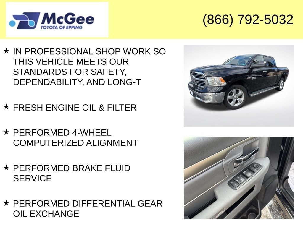 RELIABLE, SAFE FOR THE FAMILY AND A GREAT DAILY DRIVER, NON SMOKER VEHICLE, MUST SEE, TRANSPARENT PRICING AND A HASSLE-FREE EXPERIENCE!, FUEL EFFICIENT (MORE CASH IN YOUR POCKET), PRICED TO SELL, FANTASTIC SERVICE HISTORY!, EXCELLENT COLOR COMBINATION, ONE OWNER, WAS SPENT IN PROFESSIONAL SHOP WORK SO THIS VEHICLE MEETS OUR STANDARDS FOR SAFETY, DEPENDABILITY,, FRESH ENGINE OIL & FILTER, PERFORMED 4-WHEEL COMPUTERIZED ALIGNMENT, PERFORMED BRAKE FLUID SERVICE, PERFORMED DIFFERENTIAL GEAR OIL EXCHANGE, BRAND NEW SPARK PLUGS INSTALLED, PERFORMED COOLANT FLUSH SERVICE. At McGee Toyota Of Epping we want you to know that all our vehicles are priced at a competitive value position to the market. We use an independent 3rd party software to research internet listings on all vehicles in the market so we can ensure that our prices are the most competitive out there. We do this simply so people choose us when they start searching for their next car. CARFAX One-Owner. Clean CARFAX. 2016 Ram 1500 Big Horn 4D Crew Cab Brilliant Black Crystal Pearlcoat 4WD 8-Speed Automatic HEMI 5.7L V8 Multi Displacement VVT McGee Toyota is a Family-Owned Business and we enjoy assisting all of our guests buying their next vehicle!