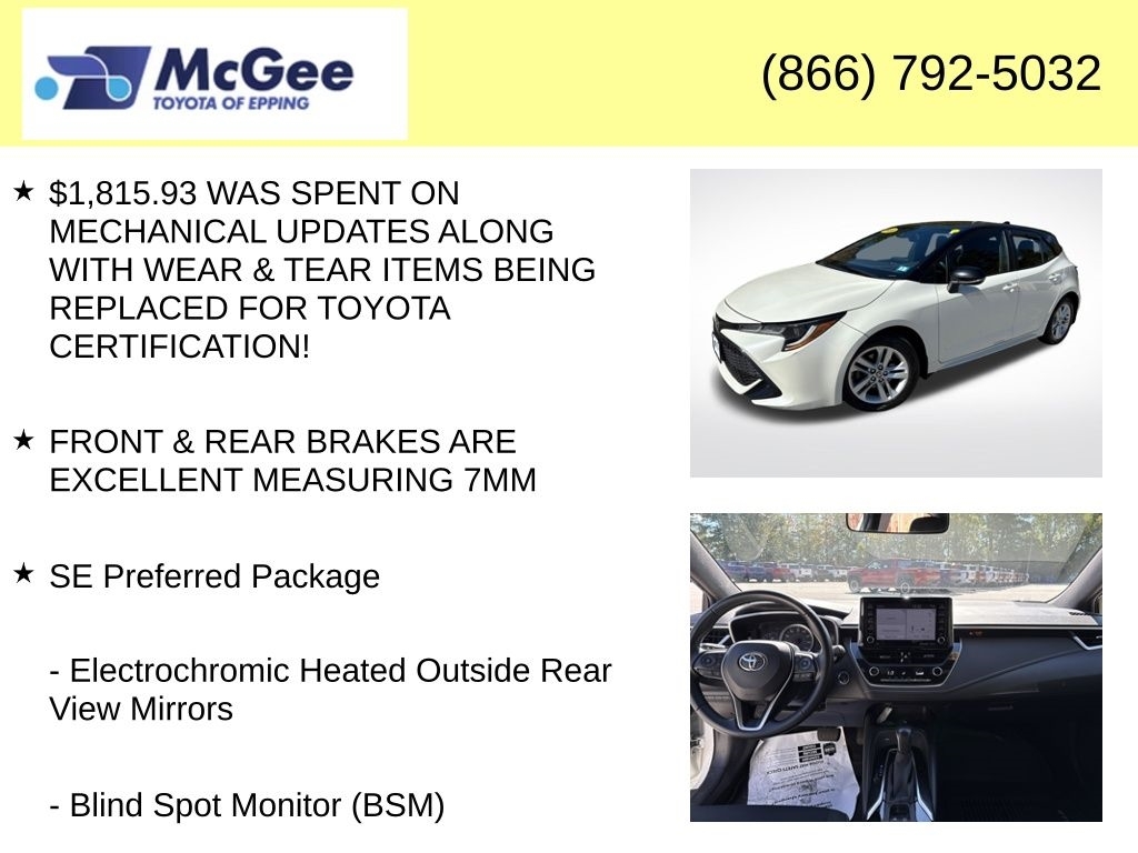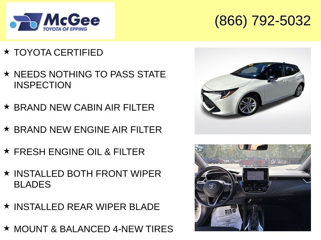 Recent Arrival! TOYOTA CERTIFIED, NEEDS NOTHING TO PASS STATE INSPECTION, BRAND NEW CABIN AIR FILTER, BRAND NEW ENGINE AIR FILTER, FRESH ENGINE OIL & FILTER, INSTALLED BOTH FRONT WIPER BLADES, INSTALLED REAR WIPER BLADE, MOUNT & BALANCED 4-NEW TIRES, $1,815.93 WAS SPENT ON MECHANICAL UPDATES ALONG WITH WEAR & TEAR ITEMS BEING REPLACED FOR TOYOTA CERTIFICATION!, FRONT & REAR BRAKES ARE EXCELLENT MEASURING 7MM, Blind Spot Monitor (BSM), Electrochromic Heated Outside Rear View Mirrors, Radio: Audio Plus AM/FM/HD, SE Preferred Package. At McGee Toyota Of Epping we want you to know that all our vehicles are priced at a competitive value position to the market. We use an independent 3rd party software to research internet listings on all vehicles in the market so we can ensure that our prices are the most competitive out there. We do this simply so people choose us when they start searching for their next car. Clean CARFAX. 2020 Toyota Corolla Hatchback SE 5D Hatchback Blizzard Pearl w/Midnight Black Roof FWD CVT 2.0L I4 Certified. Toyota Gold Certified Details: * Warranty Deductible: $0 * Roadside Assistance for 7 Year / 100,000 Mile. Standard New-Car Financing Rates Available. Warranty honored at over 1,400 Toyota dealers in the continental U.S. & Canada. Trade-ins accepted. Trouble-free handling of your transaction, including DMV paperwork * Vehicle History * 160 Point Inspection * Transferable Warranty * Powertrain Limited Warranty: 84 Month/100,000 Mile (whichever comes first) from TCUV purchase date * Roadside Assistance * Limited Warranty: 12 Month/12,000 Mile Limited Comprehensive Warranty: 12 Month/12,000 Mile (whichever comes first) from certified purchase date McGee Toyota is a Family-Owned Business and we enjoy assisting all of our guests buying their next vehicle!