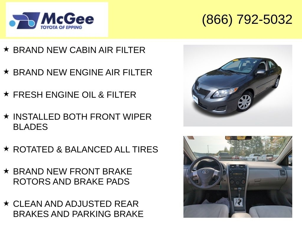 Recent Arrival! BRAND NEW CABIN AIR FILTER, BRAND NEW ENGINE AIR FILTER, FRESH ENGINE OIL & FILTER, INSTALLED BOTH FRONT WIPER BLADES, ROTATED & BALANCED ALL TIRES, BRAND NEW FRONT BRAKE ROTORS AND BRAKE PADS, CLEAN AND ADJUSTED REAR BRAKES AND PARKING BRAKE, PERFORMED BRAKE FLUID SERVICE, BRAND NEW SPARK PLUGS INSTALLED, FRONT CALIPERS REPLACED., PERFORMED FUEL INDUCTION SERVICE!, $2,029.78 WAS SPENT ON MECHANICAL WORK ALONG WITH WEAR & TEAR ITEMS REPLACED., ABS brakes, Electronic Stability Control, Illuminated entry, Low tire pressure warning, Traction control. At McGee Toyota Of Epping we want you to know that all our vehicles are priced at a competitive value position to the market. We use an independent 3rd party software to research internet listings on all vehicles in the market so we can ensure that our prices are the most competitive out there. We do this simply so people choose us when they start searching for their next car. Clean CARFAX. 2010 Toyota Corolla LE 4D Sedan Magnetic Gray Metallic FWD 4-Speed Automatic 1.8L I4 DOHC Dual VVT-i McGee Toyota is a Family-Owned Business and we enjoy assisting all of our guests buying their next vehicle! Awards: * 2010 KBB.com Best Resale Value Awards