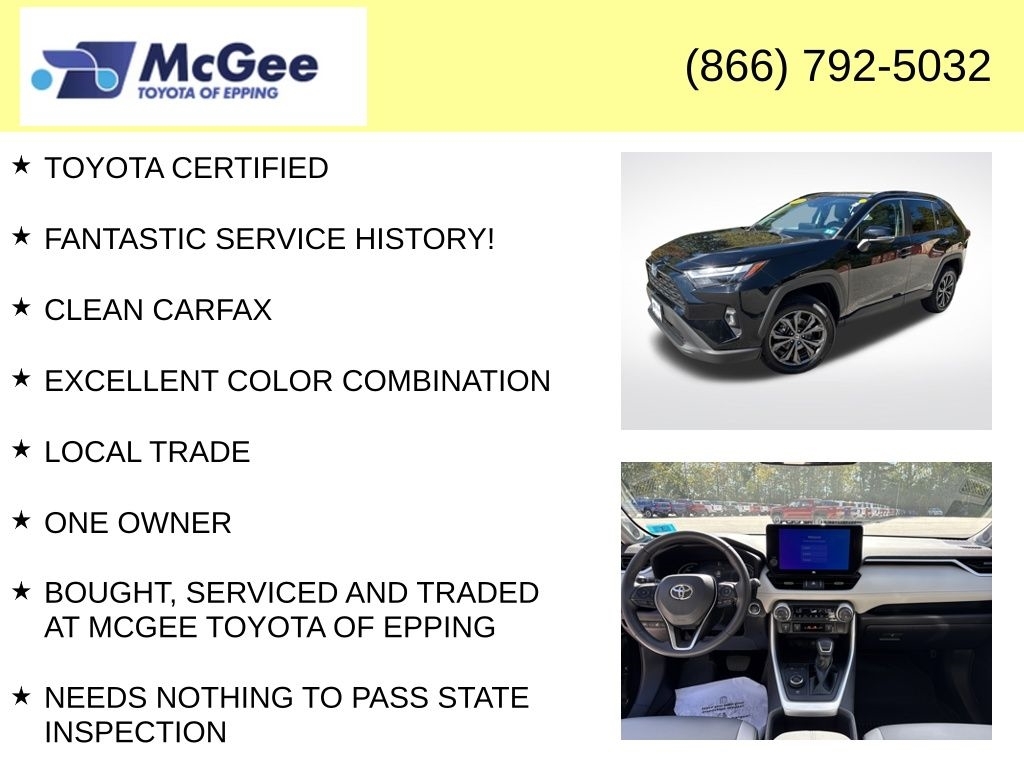 Recent Arrival! TOYOTA CERTIFIED, FANTASTIC SERVICE HISTORY!, CLEAN CARFAX, EXCELLENT COLOR COMBINATION, LOCAL TRADE, ONE OWNER, BOUGHT, SERVICED AND TRADED AT MCGEE TOYOTA OF EPPING, NEEDS NOTHING TO PASS STATE INSPECTION, BRAND NEW CABIN AIR FILTER, BRAND NEW ENGINE AIR FILTER, FRESH ENGINE OIL & FILTER, BRAND NEW FRONT BRAKE ROTORS AND BRAKE PADS, 2.5L 4-Cylinder. At McGee Toyota Of Epping we want you to know that all our vehicles are priced at a competitive value position to the market. We use an independent 3rd party software to research internet listings on all vehicles in the market so we can ensure that our prices are the most competitive out there. We do this simply so people choose us when they start searching for their next car. CARFAX One-Owner. Clean CARFAX. 2023 Toyota RAV4 Hybrid XLE Premium 4D Sport Utility Midnight Black Metallic AWD eCVT 2.5L 4-Cylinder Certified. Toyota Certified Used Hybrids Details: * HV Battery Warranty coverage for 10 years/150,000 miles. (2020 model year forward Hybrid-Related) 8 years/100,000 miles, whichever comes first, from original date of first use when sold as new. Fuel Cell Vehicle Warranty 8 years/100,000 mile (whichever comes first) on key fuel cell components. Roadside Assistance for 7 Year / 100,000 Mile * Transferable Warranty * Warranty Deductible: $0 * Vehicle History * Roadside Assistance * Limited Warranty: 12 Month/12,000 Mile Limited Comprehensive Warranty: 12 Month/12,000 Mile (whichever comes first) from certified purchase date * 160 Point Inspection * Powertrain Limited Warranty: 84 Month/100,000 Mile (whichever comes first) from TCUV purchase date McGee Toyota is a Family-Owned Business and we enjoy assisting all of our guests buying their next vehicle!