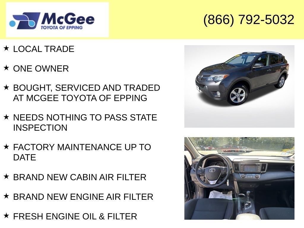 Recent Arrival! LOCAL TRADE, ONE OWNER, BOUGHT, SERVICED AND TRADED AT MCGEE TOYOTA OF EPPING, NEEDS NOTHING TO PASS STATE INSPECTION, FACTORY MAINTENANCE UP TO DATE, BRAND NEW CABIN AIR FILTER, BRAND NEW ENGINE AIR FILTER, FRESH ENGINE OIL & FILTER, INSTALLED BOTH FRONT WIPER BLADES, INSTALLED REAR WIPER BLADE, MOUNT & BALANCED 4-NEW TIRES, PERFORMED 4-WHEEL COMPUTERIZED ALIGNMENT, BRAND NEW SPARK PLUGS INSTALLED, AWD, Black w/Fabric Seat Trim. At McGee Toyota Of Epping we want you to know that all our vehicles are priced at a competitive value position to the market. We use an independent 3rd party software to research internet listings on all vehicles in the market so we can ensure that our prices are the most competitive out there. We do this simply so people choose us when they start searching for their next car. CARFAX One-Owner. 2014 Toyota RAV4 XLE 4D Sport Utility Magnetic Gray Metallic AWD 6-Speed Automatic 2.5L 4-Cylinder DOHC Dual VVT-i McGee Toyota is a Family-Owned Business and we enjoy assisting all of our guests buying their next vehicle! Awards: * 2014 KBB.com 10 Best SUVs Under $25,000 * 2014 KBB.com Best Resale Value Awards