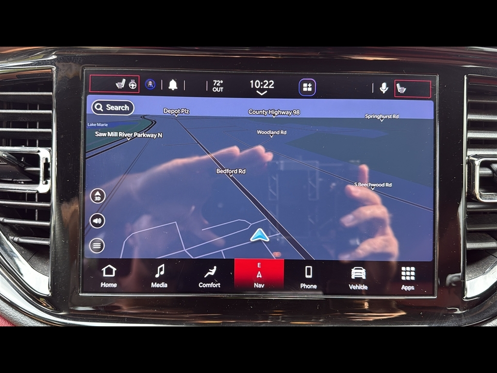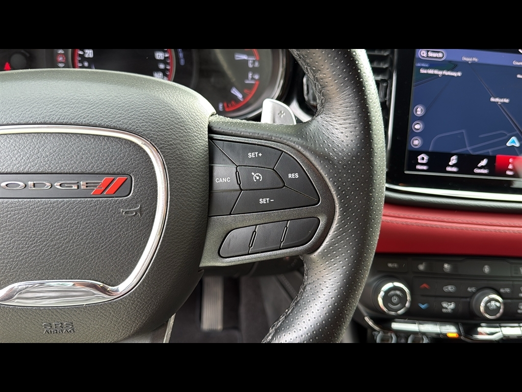 Inside the refreshed passenger cabin, new appointments include a hand-wrapped dashboard with live silver accent stitch, SRT flat-bottom performance steering wheel with standard paddle shift, heated and ventilated front and heated second-row captain’s chairs with embossed SRT logos. Nappa leather with suede inserts and silver-stitched SRT logos are standard. Demonic Red Laguna leather interior with embossed SRT logos is optional.