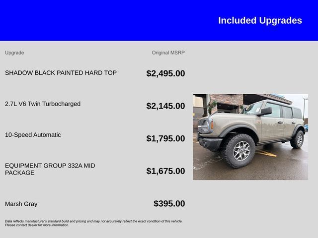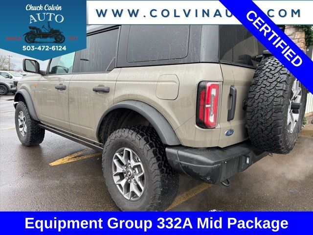 Discover the Thrill of the Open Road in this 2025 Ford Bronco BadlandsUnleash your adventurous spirit with this meticulously maintained 2025 Ford Bronco Badlands. Boasting a powerful 2.7L EcoBoost V6 engine, 10-speed automatic transmission, and 4-wheel drive, this Bronco is ready to conquer any terrain. Dressed in a stylish Gray exterior with a striking Painted Black Roof, this Bronco is a true head-turner.• APPLE CARPLAY/ ANDROID• PAINTED BLACK ROOF!• SHADOW BLACK PAINTED HARD TOP• Hard Top Sound Deadening Headliner, Rear-Window Defroster & Washer• 2.7L V6 Twin Turbocharged (EcoBoost) (Includes GVWR: 6,180 lbs)• 10-Speed Automatic (Includes Remote Start System, Trail Control, Trail Turn Assist, Trail One-Pedal Driving & 4.46 Axle Ratio)• Equipment Group 332A Mid PackageIndulge in the premium features that set this Bronco apart, including Dual-Zone Electronic Automatic Temperature Control, Power Outlet - Back Side of Center Floor Console, 2-Door Intelligent Access with Lock/Unlock, Rear Parking Sensors, Ambient Footwell Lighting, Connected Navigation, and Illuminated Sliding Visor Vanity Mirrors. Pamper yourself with the Front Row Heated Seats and Dual Smart Charging USB Ports.This Ford Bronco Badlands has been meticulously inspected and certified to Ford's rigorous standards, giving you the peace of mind you deserve. Enjoy the added benefits of a 172-Point Inspection, Roadside Assistance, a Transferable Warranty, and a 12-Month/12,000-Mile Limited Warranty after the original coverage expires. Plus, you'll receive 22,000 FordPass Rewards Points to use towards your first two maintenance visits.Don't miss your chance to own this exceptional 2025 Ford Bronco Badlands. Schedule a test drive today and experience the ultimate in off-road capability and on-road comfort.Sales Tax, Title, License Fee, Registration Fee, $250 Dealer Document Fee are additional to the listed price and may be added to the sale price or capitalized cost. All vehicles are subject to prior sale. Please contact the Sales Team to confirm the availability and pricing of all vehicles.