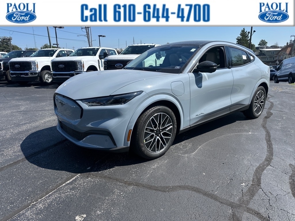 The 2025 Ford Mustang Mach-E Premium SUV is a vehicle that is sure to turn heads. This all wheel drive Electric 311hp 427 lb-ft engine has a glacier gray metallic tri-coat exterior and a light space gray interior. It has a 5 out of 5 star crash test rating and features such as touch screen display, Bluetooth audio connection, blind spot sensor, on demand four wheel drive, navigation system with voice recognition, navigation with touch screen display, Bluetooth phone connectivity, and leather seats. With an impressive fuel economy of 104 mpg in the city and 96 mpg on the highway, this car is sure to be a reliable and efficient mode of transportation for years to come. Thank you for considering Paoli Ford for your next new vehicle purchase! We strive to make your experience transparent and hassle free! Stop by today to see why the community has chosen us since 1921!