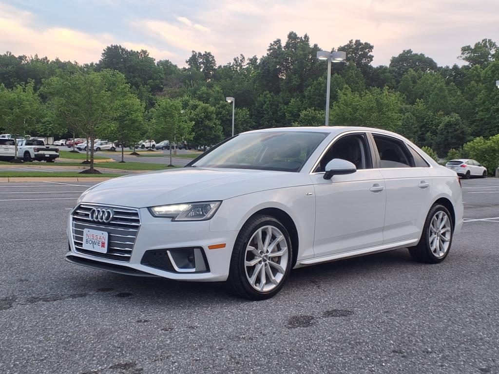 7-Speed Automatic S tronic, quattro, Black Leather, 10 Speakers, 4-Cylinder / 4cyl / i4 - All the POWER, better MPG, 4-Wheel Disc Brakes, ABS brakes, All Wheel Drive / AWD - Never Worry About the Weather!, Alloy wheels, AM/FM radio, Audi smartphone interface (Apple CarPlay/Android Auto), Auto-dimming Rear-View mirror, Below Market Value, Blind Spot Warning System / BSM / BSW / BLIS, Bluetooth Hands Free Phone System, Brake assist, Bumpers: body-color, Check out this 2019 Audi A4 in Glacier White with Black Leather, Compass, Delay-off headlights, Driver door bin, Driver vanity mirror, Dual front side impact airbags, Electronic Stability Control, Exterior Parking Camera Rear, Four wheel independent suspension, Front Bucket Seats, Front Center Armrest, Front fog lights, Front reading lights, Garage door transmitter: HomeLink, Genuine wood console insert, Genuine wood dashboard insert, Genuine wood door panel insert, Great MPG, Heated door mirrors, Heated Front Bucket Seats, Heated front seats, Heated Seats, High intensity discharge headlights: Xenon plus, Illuminated entry, Knee airbag, Leather Seating Surfaces, Leather Shift Knob, Leather steering wheel, Low Miles!, Low Monthly Payment, Low tire pressure warning, Moonroof / Sunroof, Navigation / Maps / GPS / Nav, No Money Down / $0 Down, Occupant sensing airbag, Overhead console, Panic alarm, Passenger door bin, Passenger vanity mirror, Power door mirrors, Power moonroof, Power passenger seat, Push Button Start!, Rain sensing wipers, Rear anti-roll bar, Rear fog lights, Rear reading lights, Rear-View Back up Camera, SiriusXM!, Speed control, Speed-sensing steering, Speed-Sensitive Wipers, Tachometer, Telescoping steering wheel, Tilt steering wheel, Turn signal indicator mirrors, Variably intermittent wipers, Wheels: 175-Arm Design. Recent Arrival! 23/34 City/Highway MPG Please contact a Nissan of Bowie Product Specialist at 301-867-6150 for more information. All our prices exclude tax, tags, dealer processing fee.