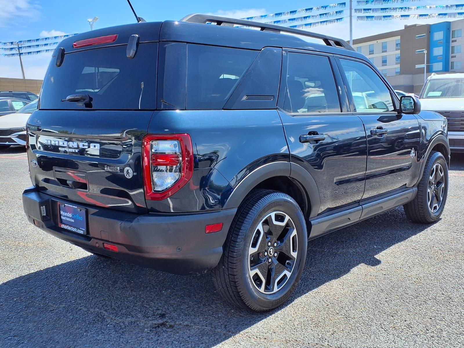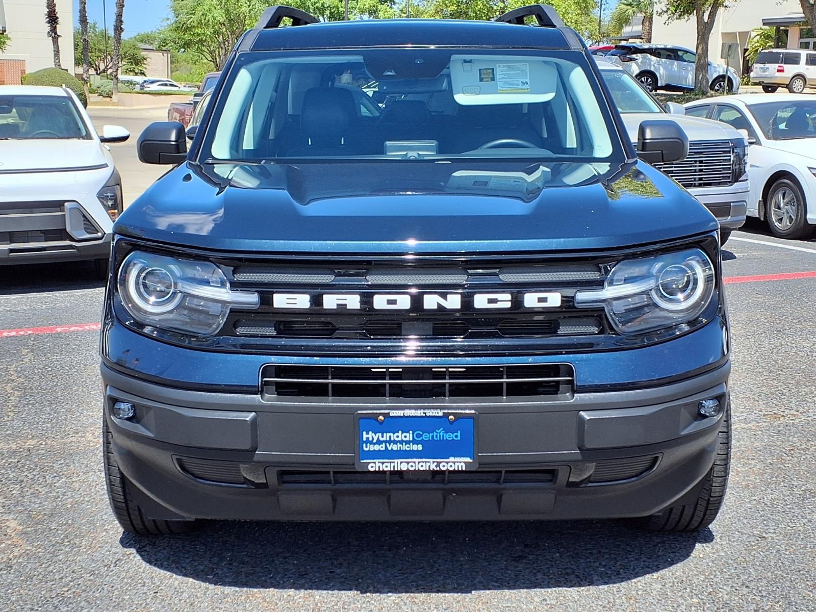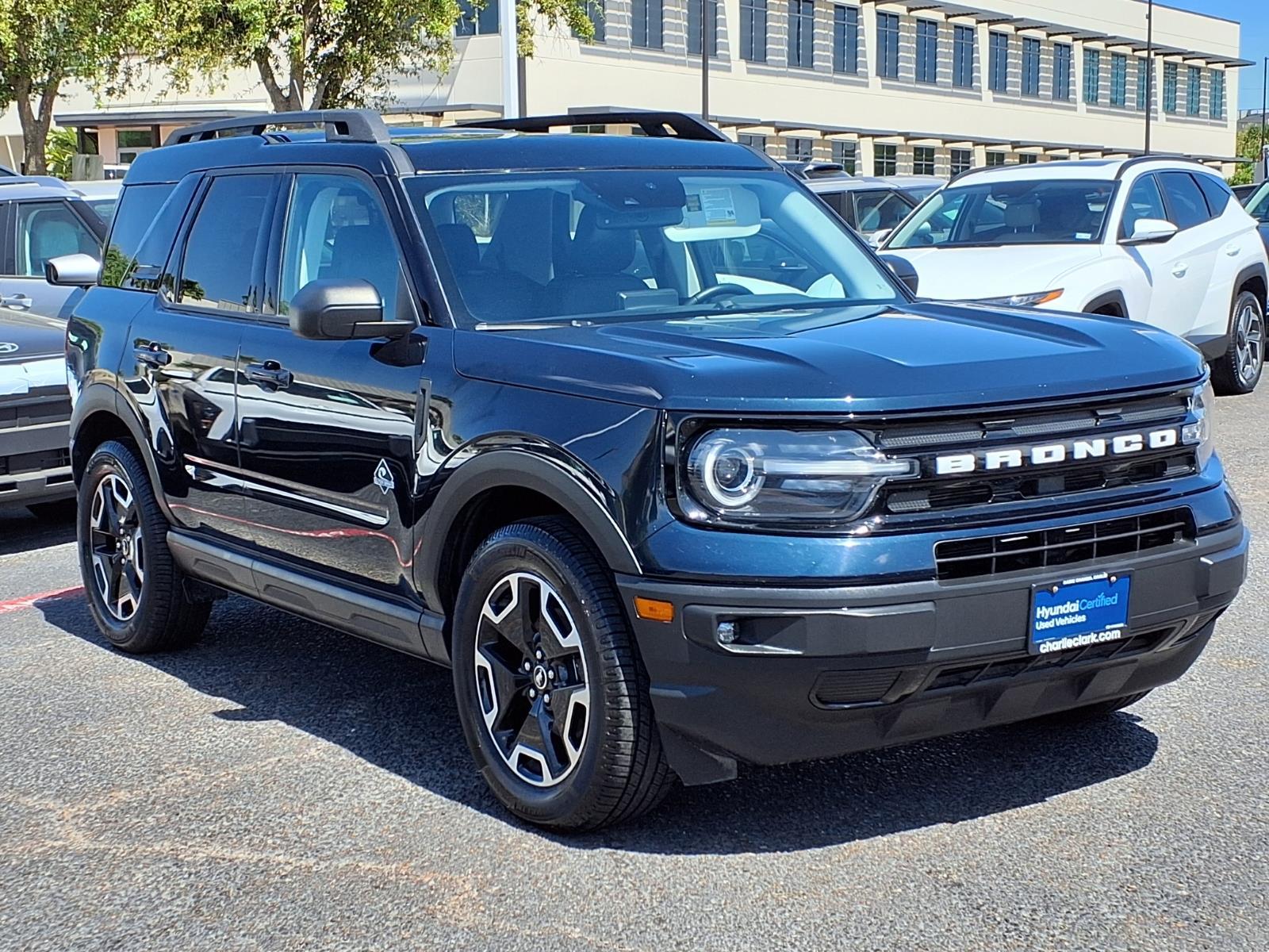 Alto Blue Metallic Tinted Clearcoat 2022 Ford Bronco Sport Outer Banks 4WD 8-Speed Automatic 1.5L EcoBoost 3.80 Axle Ratio, 4-Wheel Disc Brakes, 6 Speakers, ABS brakes, Air Conditioning, Alloy wheels, AM/FM radio: SiriusXM, AM/FM Stereo, Auto High-beam Headlights, Auto-dimming Rear-View mirror, Automatic temperature control, Brake assist, Compass, Delay-off headlights, Driver door bin, Driver vanity mirror, Dual front impact airbags, Dual front side impact airbags, Electronic Stability Control, Emergency communication system: SYNC 3 911 Assist, Equipment Group 300A, Four wheel independent suspension, Front anti-roll bar, Front Bucket Seats, Front Center Armrest, Front dual zone A/C, Front fog lights, Front reading lights, Fully automatic headlights, HD Radio, Heated door mirrors, Heated front seats, Heated steering wheel, Illuminated entry, Knee airbag, Leather Trimmed Heated Sport Contour Bucket Seats, Low tire pressure warning, Occupant sensing airbag, Outside temperature display, Overhead airbag, Overhead console, Panic alarm, Passenger door bin, Passenger vanity mirror, Power door mirrors, Power driver seat, Power Moonroof, Power passenger seat, Power steering, Power windows, Radio data system, Rain sensing wipers, Rear anti-roll bar, Rear Parking Sensors, Rear reading lights, Rear seat center armrest, Rear window defroster, Rear window wiper, Remote keyless entry, Roof rack: rails only, Security system, SiriusXM Radio, Speed control, Speed-sensing steering, Speed-Sensitive Wipers, Split folding rear seat, Steering wheel mounted audio controls, SYNC 3 Communications & Entertainment System, SYNC 3/Apple CarPlay/Android Auto, Tachometer, Tech Package, Telescoping steering wheel, Tilt steering wheel, Traction control, Trip computer, Universal Garage Door Opener (UGDO), Variably intermittent wipers, Wheels: 18Ebony Black-Painted Aluminum, Wireless Charging Pad. With a reputation for exceptional service and customer satisfaction, were here to make your car-buying experience smooth and enjoyable. Plus, with Nanas Lifetime Warranty comes at no cost, covering the engine, transmission, and drive axles for life at no cost, you can trust that your investment is protected for the long haul. Exceptional Features: Recent Arrival! Odometer is 2359 miles below market average! 25/28 City/Highway MPG Come by Charlie Clark Hyundai Laredo today and experience the quality and reliability of the Ford Bronco Sport firsthand. Dont forget, we offer Nanas Lifetime Warranty,