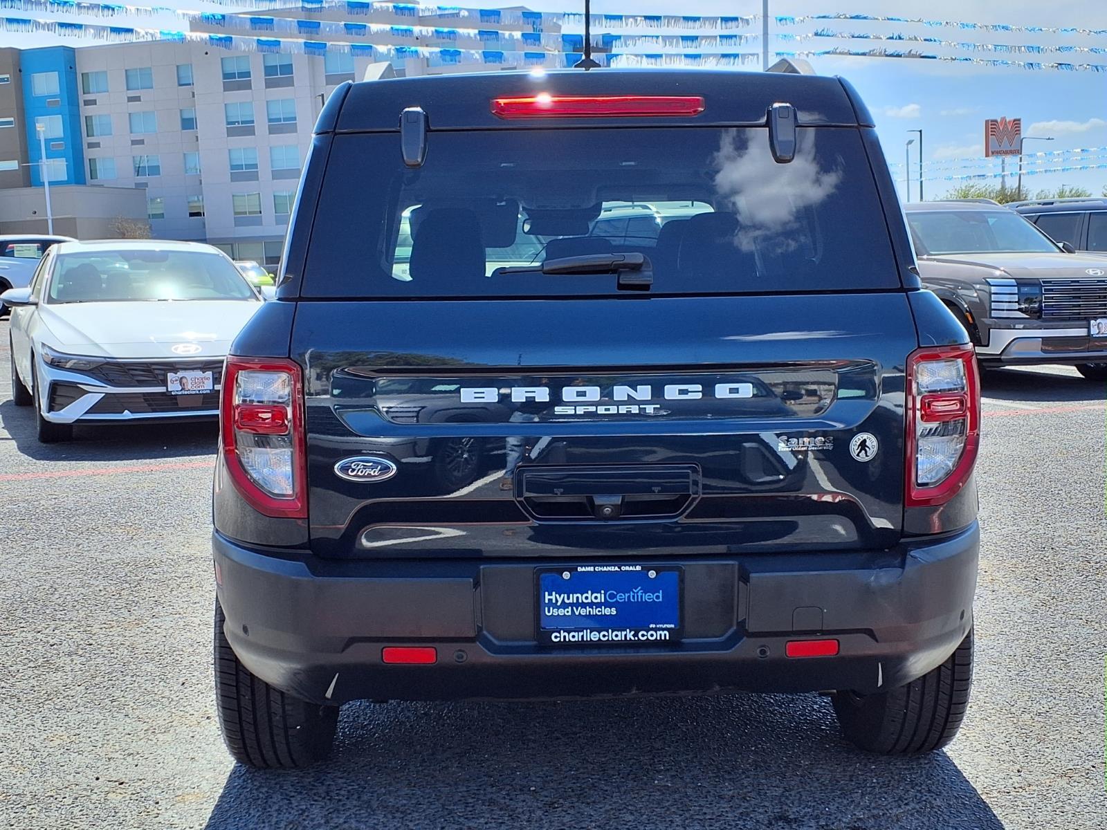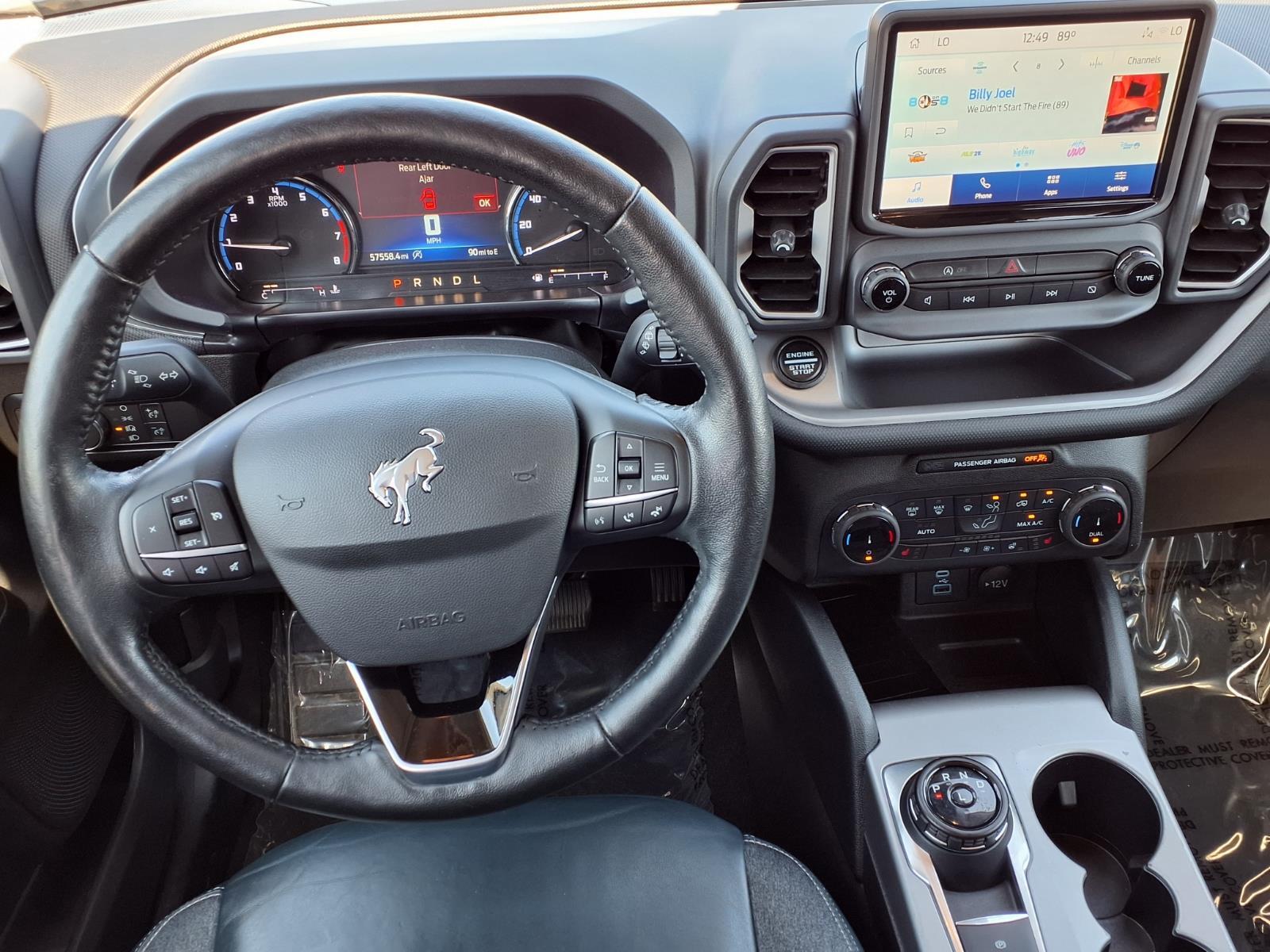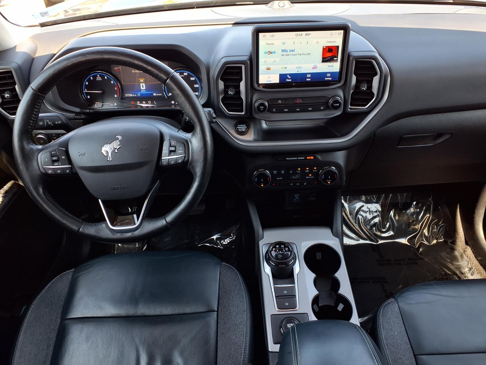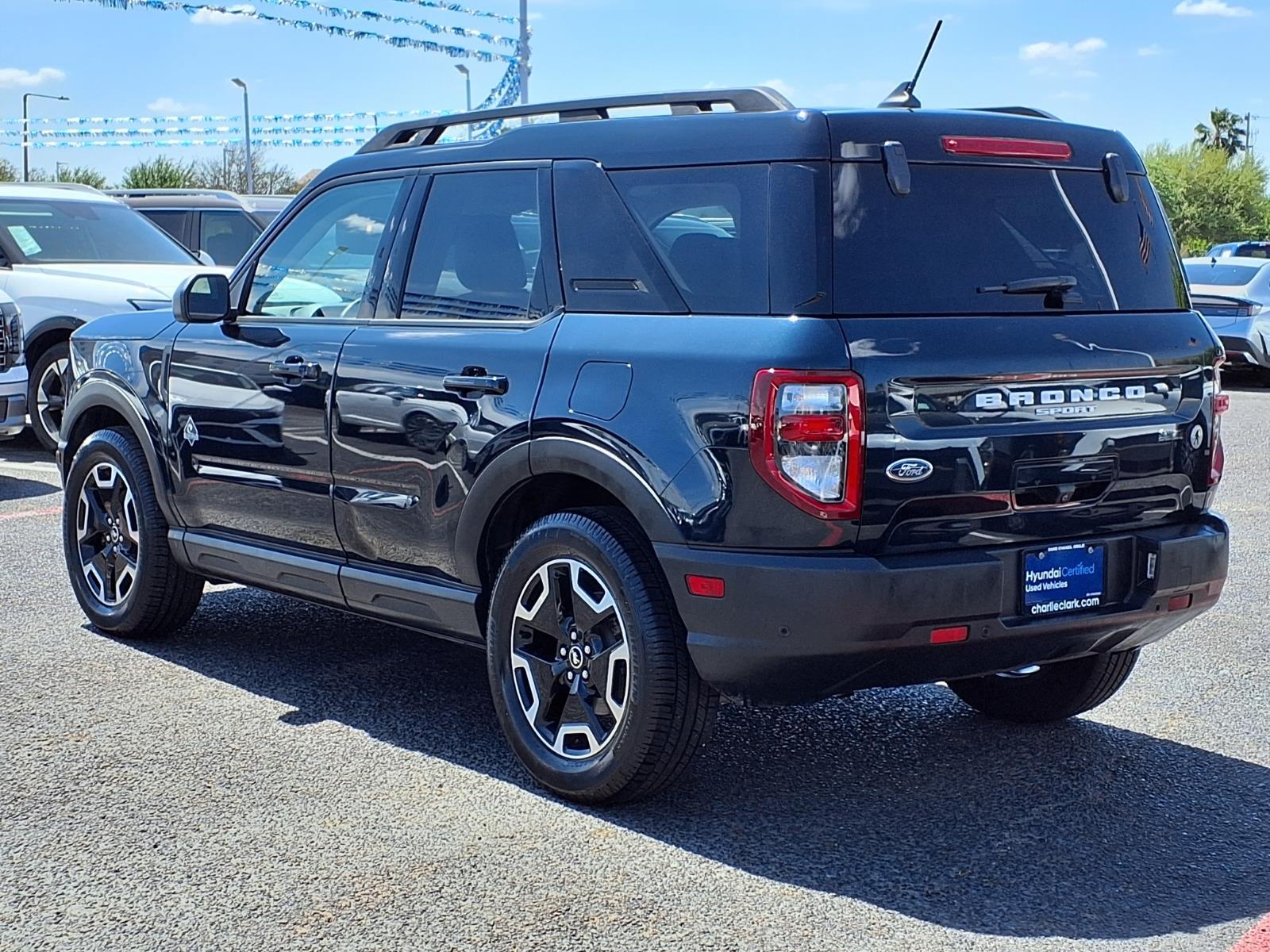 Alto Blue Metallic Tinted Clearcoat 2022 Ford Bronco Sport Outer Banks 4WD 8-Speed Automatic 1.5L EcoBoost 3.80 Axle Ratio, 4-Wheel Disc Brakes, 6 Speakers, ABS brakes, Air Conditioning, Alloy wheels, AM/FM radio: SiriusXM, AM/FM Stereo, Auto High-beam Headlights, Auto-dimming Rear-View mirror, Automatic temperature control, Brake assist, Compass, Delay-off headlights, Driver door bin, Driver vanity mirror, Dual front impact airbags, Dual front side impact airbags, Electronic Stability Control, Emergency communication system: SYNC 3 911 Assist, Equipment Group 300A, Four wheel independent suspension, Front anti-roll bar, Front Bucket Seats, Front Center Armrest, Front dual zone A/C, Front fog lights, Front reading lights, Fully automatic headlights, HD Radio, Heated door mirrors, Heated front seats, Heated steering wheel, Illuminated entry, Knee airbag, Leather Trimmed Heated Sport Contour Bucket Seats, Low tire pressure warning, Occupant sensing airbag, Outside temperature display, Overhead airbag, Overhead console, Panic alarm, Passenger door bin, Passenger vanity mirror, Power door mirrors, Power driver seat, Power Moonroof, Power passenger seat, Power steering, Power windows, Radio data system, Rain sensing wipers, Rear anti-roll bar, Rear Parking Sensors, Rear reading lights, Rear seat center armrest, Rear window defroster, Rear window wiper, Remote keyless entry, Roof rack: rails only, Security system, SiriusXM Radio, Speed control, Speed-sensing steering, Speed-Sensitive Wipers, Split folding rear seat, Steering wheel mounted audio controls, SYNC 3 Communications & Entertainment System, SYNC 3/Apple CarPlay/Android Auto, Tachometer, Tech Package, Telescoping steering wheel, Tilt steering wheel, Traction control, Trip computer, Universal Garage Door Opener (UGDO), Variably intermittent wipers, Wheels: 18Ebony Black-Painted Aluminum, Wireless Charging Pad. With a reputation for exceptional service and customer satisfaction, were here to make your car-buying experience smooth and enjoyable. Plus, with Nanas Lifetime Warranty comes at no cost, covering the engine, transmission, and drive axles for life at no cost, you can trust that your investment is protected for the long haul. Exceptional Features: Recent Arrival! Odometer is 2359 miles below market average! 25/28 City/Highway MPG Come by Charlie Clark Hyundai Laredo today and experience the quality and reliability of the Ford Bronco Sport firsthand. Dont forget, we offer Nanas Lifetime Warranty,