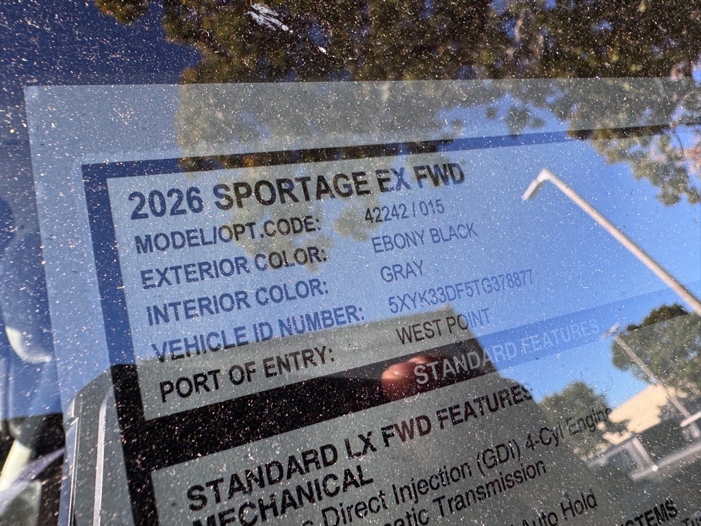 2026 Kia Sportage EX Ebony Black 18x 7.5J Alloy Wheels, 4-Wheel Disc Brakes, 6 Speakers, ABS brakes, Air Conditioning, Alloy wheels, Auto High-beam Headlights, Automatic temperature control, Brake assist, Bumpers: body-color, Delay-off headlights, Driver door bin, Driver vanity mirror, Dual front impact airbags, Dual front side impact airbags, Electronic Stability Control, Emergency communication system: Kia Connect (includes 1 year free trial), Four wheel independent suspension, Front anti-roll bar, Front Bucket Seats, Front Center Armrest, Front dual zone A/C, Fully automatic headlights, Heated door mirrors, Heated Front Bucket Seats, Heated front seats, Illuminated entry, Leather Shift Knob, Leather steering wheel, Low tire pressure warning, Occupant sensing airbag, Outside temperature display, Overhead airbag, Overhead console, Panic alarm, Passenger door bin, Passenger vanity mirror, Power door mirrors, Power driver seat, Power Liftgate, Power steering, Power windows, Radio: AM/FM/HD Audio System, Rain sensing wipers, Rear anti-roll bar, Rear seat center armrest, Rear side impact airbag, Rear window defroster, Rear window wiper, Remote keyless entry, Security system, Speed control, Speed-sensing steering, Split folding rear seat, Spoiler, Steering wheel mounted audio controls, SynTex Leatherette Seat Trim, Tachometer, Telescoping steering wheel, Tilt steering wheel, Traction control, Trip computer, Turn signal indicator mirrors, Variably intermittent wipers. 4D Sport Utility FWD 8-Speed Automatic I4 25/33 City/Highway MPG 25/33 City/Highway MPG Thank you for checking out our website at www.KiaOfGreenville.com where we help you find the best vehicle that meets your needs wrapped in a deal you will not want to walk away from. If you have any questions please call us at 864-412-4061 or visit us in person at Fred Anderson Kia of Greenville located at 2424 Laurens Rd Greenville, SC 29607 to learn more! Qualifying New Vehicles bought and serviced here receive our FULL ANDERSON FAMILY PLAN at NO COST to YOU! Our full family plan includes: Peace of Mind 3-Day Vehicle Exchange*Lifetime Oil Changes*Service Loaners*Loyalty Discounts after 50,000 miles All prices exclude tax, tag, license, title, and registration for your state; and our admin ($499) fees. All vehicle internet pricing is subject to change and requires standard financing. From time to time in the transfer of data on the internet, there are errors. Dealer is not responsible for errors in advertis
