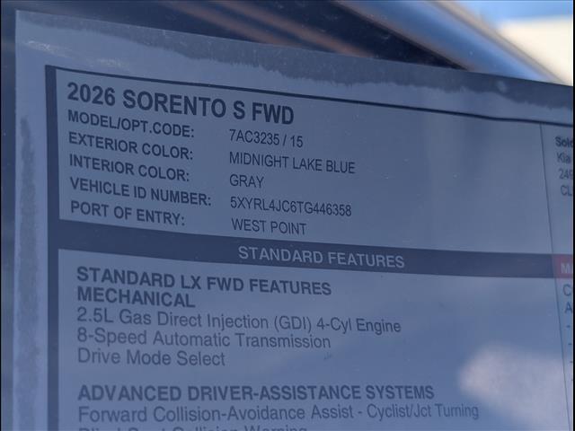 Midnight Lake Blue 2026 Kia Sorento S FWD 8-Speed Automatic 2.5L I4 DGI DOHC 16V LEV3-SULEV30 191hpRecent Arrival! 23/31 City/Highway MPG