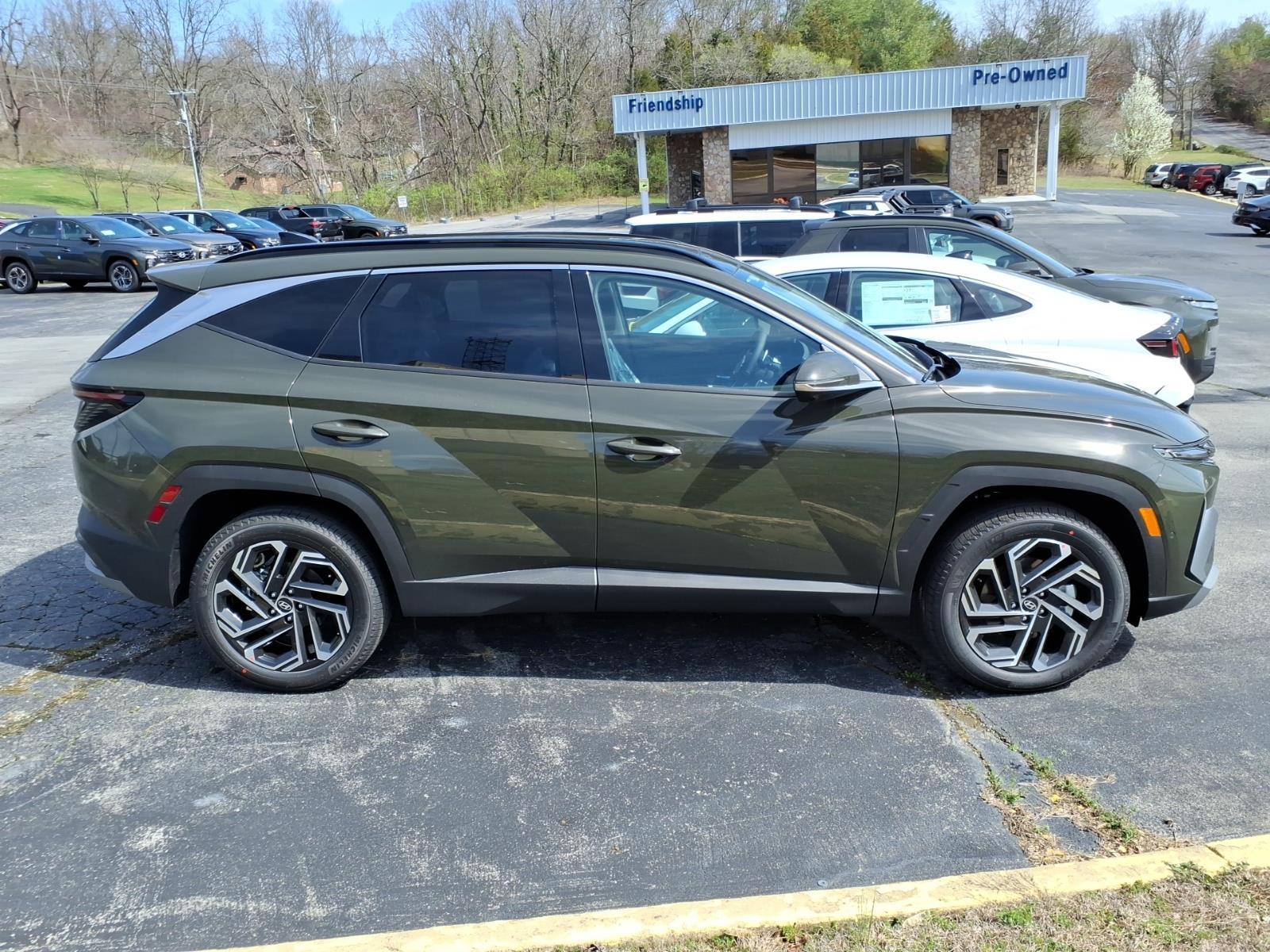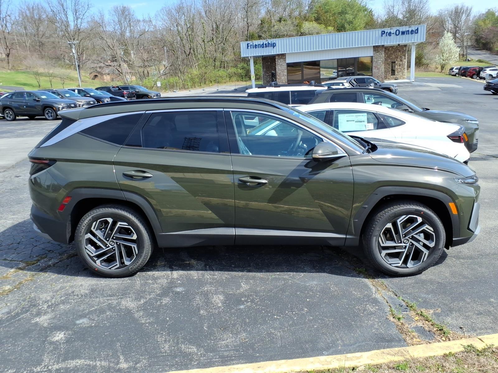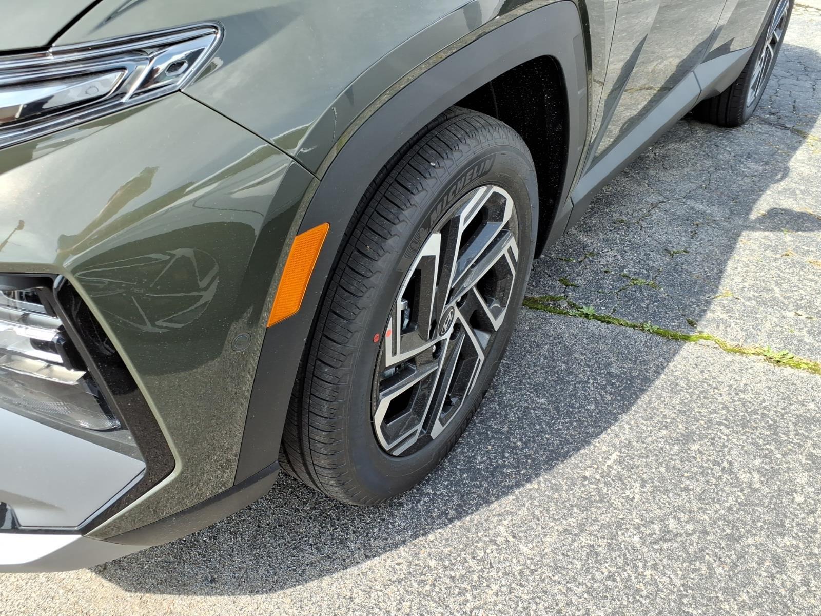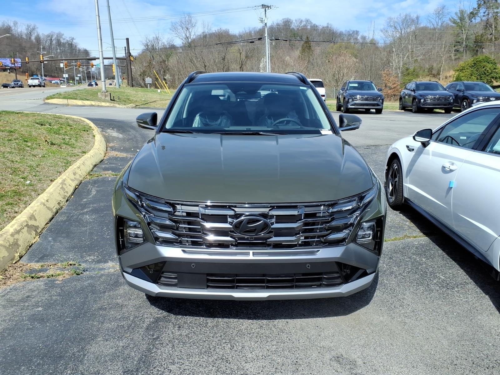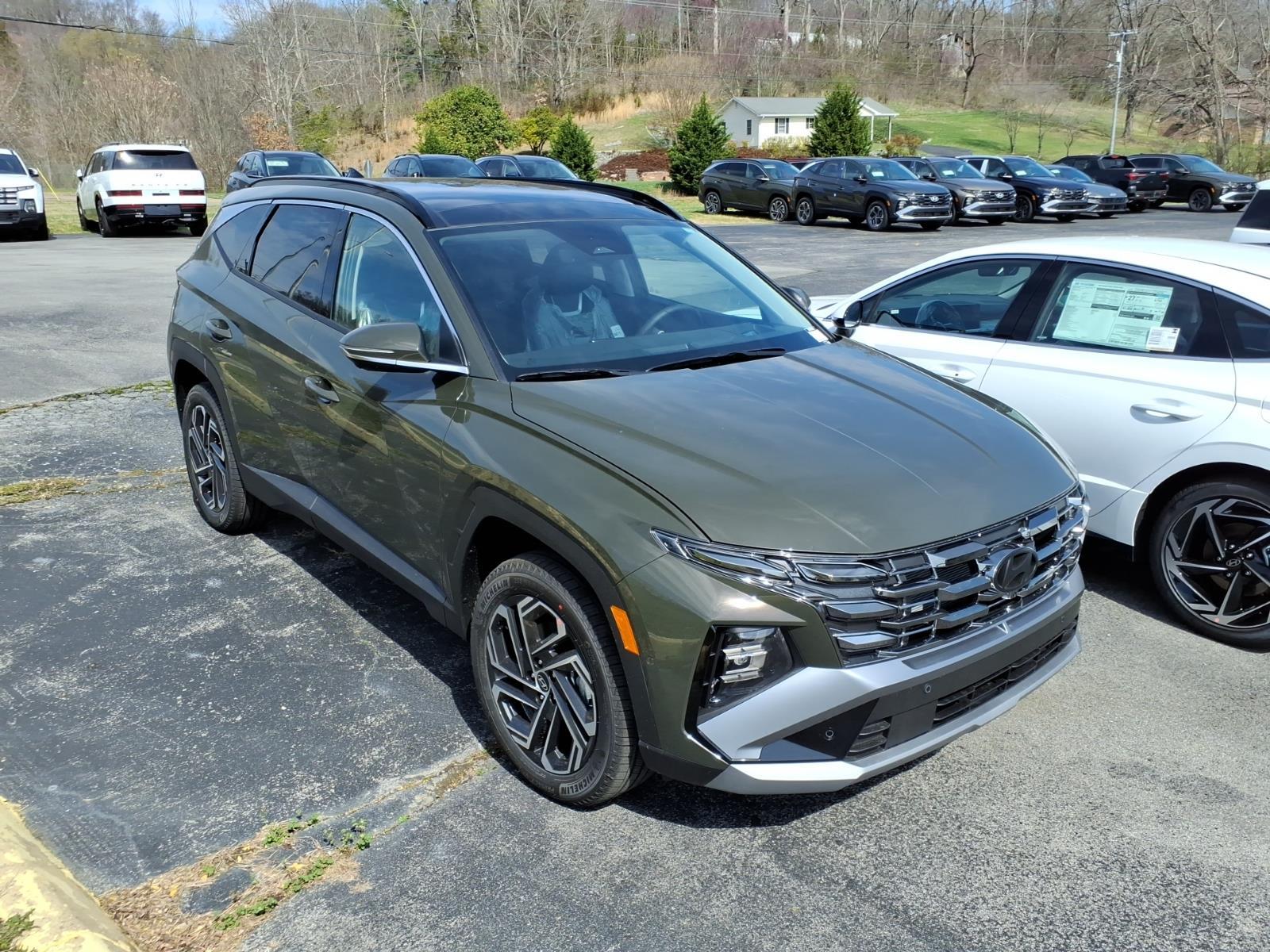 INFORMATION ABOUT THIS VEHICLE AND IT FEATURES:, AWD. Option Group 01, AWD, 4-Wheel Disc Brakes, 8 Speakers, ABS brakes, Air Conditioning, Alloy wheels, AM/FM radio: SiriusXM, Apple CarPlay & Android Auto, Auto High-beam Headlights, Auto-dimming Rear-View mirror, Automatic temperature control, Brake assist, Bumpers: body-color, Cargo Net, Carpeted Floor Mats, Delay-off headlights, Driver door bin, Driver vanity mirror, Dual front impact airbags, Dual front side impact airbags, Electronic Stability Control, Emergency communication system: None, First Aid Kit, Four wheel independent suspension, Front anti-roll bar, Front Bucket Seats, Front Center Armrest, Front dual zone A/C, Front reading lights, Fully automatic headlights, Garage door transmitter: HomeLink, Heads-Up Display, Heated and Ventilated Front Bucket Seats, Heated door mirrors, Heated front seats, Heated rear seats, Heated steering wheel, Illuminated entry, Leather Seat Trim, Leather Shift Knob, Leather steering wheel, Low tire pressure warning, Memory seat, Navigation System, Occupant sensing airbag, Outside temperature display, Overhead airbag, Overhead console, Panic alarm, Passenger door bin, Passenger vanity mirror, Power door mirrors, Power driver seat, Power Liftgate, Power moonroof, Power passenger seat, Power steering, Power windows, Radio data system, Radio: Bose Premium w/AM/FM/HD Audio System, Rain sensing wipers, Rear anti-roll bar, Rear reading lights, Rear seat center armrest, Rear side impact airbag, Rear window defroster, Rear window wiper, Remote keyless entry, Roadside Assistance Kit, Security system, Speed control, Split folding rear seat, Spoiler, Steering wheel mounted audio controls, Tachometer, Telescoping steering wheel, Tilt steering wheel, Tow Hitch, Traction control, Trip computer, Turn signal indicator mirrors, Variably intermittent wipers, Ventilated front seats, and Wheels: 19x 7.5J Alloy. Rockwood Green 2026 Hyundai Tucson Limited AWD 8-Speed Automatic with SHIFTRONIC 2.5L I4 DGI DOHC 16V LEV3-SULEV30 187hp 24/30 City/Highway MPG