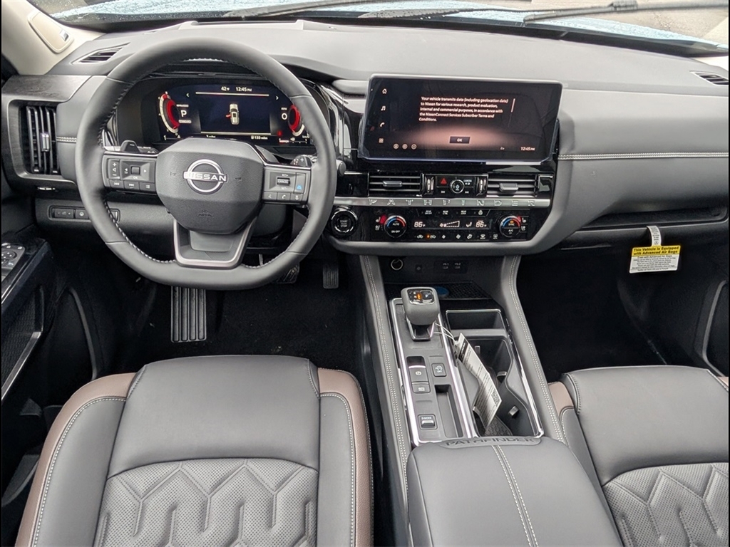 Boulder Gray Pearl 2026 Nissan Pathfinder Platinum 3.5L V6 DOHC FWD 4D Sport Utility 9-Speed Automatic * Bluetooth/Handsfree Calling *, * USB Adapter *, Pathfinder Platinum, 4D Sport Utility, 3.5L V6 DOHC, 9-Speed Automatic, FWD, Boulder Gray Pearl, Charcoal Leather, Cargo Area Protector, Cargo Net, Cargo Package, First Aid, 13 Speakers, 3rd row seats: bench, 4-Piece Black Splash Guards, 4-Wheel Disc Brakes, ABS brakes, Air Conditioning, Alloy wheels, AM/FM radio: SiriusXM w/360L, Auto High-beam Headlights, Auto tilt-away steering wheel, Auto-dimming Rear-View mirror, Automatic temperature control, Bench Seat Carpeted Floor Mats, Bodyside moldings, Bose Premium Audio System, Brake assist, Bumpers: body-color, Climate Controlled Front Bucket Seats, Cross Bars, Delay-off headlights, Driver door bin, Driver vanity mirror, Dual front impact airbags, Dual front side impact airbags, Electronic Stability Control, Emergency communication system: NissanConnect Services, Four wheel independent suspension, Front anti-roll bar, Front Bucket Seats, Front Center Armrest, Front dual zone A/C, Front reading lights, Fully automatic headlights, Garage door transmitter: HomeLink, Heads-Up Display, Heated door mirrors, Heated front seats, Heated rear seats, Heated steering wheel, Illuminated entry, Knee airbag, Low tire pressure warning, Memory seat, NissanConnect featuring Apple CarPlay and Android Auto, Occupant sensing airbag, Outside temperature display, Overhead airbag, Overhead console, Panic alarm, Passenger door bin, Passenger vanity mirror, Power door mirrors, Power driver seat, Power Liftgate, Power moonroof, Power passenger seat, Power steering, Power windows, Premium Paint, Radio data system, Radio: AM/FM Audio System with NissanConnect, Rain sensing wipers, Rear air conditioning, Rear anti-roll bar, Rear reading lights, Rear seat center armrest, Rear side impact airbag, Rear window defroster, Rear window wiper, Reclining 3rd row seat, Remote keyless entry, Security system, Semi-Aniline Leather-Appointed Seating Surfaces, Speed control, Speed-sensing steering, Speed-Sensitive Wipers, Split folding rear seat, Spoiler, Steering wheel memory, Steering wheel mounted audio controls, Tachometer, Telescoping steering wheel, Tilt steering wheel, Traction control, Trip computer, Turn signal indicator mirrors, Variably intermittent wipers, Ventilated front seats, Wheels: 20Machined Alloy, Pathfinder Platinum, 4D Sport Utility, 3.5L V6 DOHC, 9-Speed Automatic, FWD, Boulder