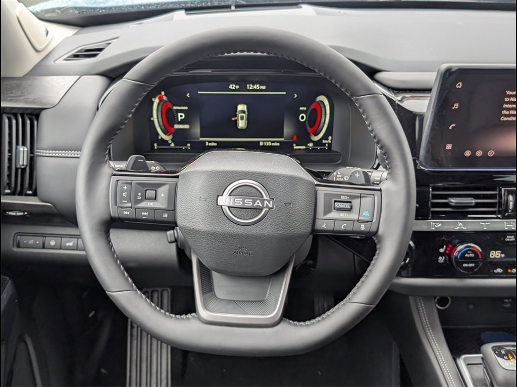 Everest White Pearl/Black 2026 Nissan Pathfinder Platinum 3.5L V6 DOHC FWD 4D Sport Utility 9-Speed Automatic * Bluetooth/Handsfree Calling *, * USB Adapter *, Pathfinder Platinum, 4D Sport Utility, 3.5L V6 DOHC, 9-Speed Automatic, FWD, Everest White Pearl/Black, Charcoal Leather, Cargo Area Protector, Cargo Net, Cargo Package, First Aid, 13 Speakers, 3rd row seats: bench, 4-Piece Black Splash Guards, 4-Wheel Disc Brakes, ABS brakes, Air Conditioning, Alloy wheels, AM/FM radio: SiriusXM w/360L, Auto High-beam Headlights, Auto tilt-away steering wheel, Auto-dimming Rear-View mirror, Automatic temperature control, Bench Seat Carpeted Floor Mats, Bodyside moldings, Bose Premium Audio System, Brake assist, Bumpers: body-color, Climate Controlled Front Bucket Seats, Cross Bars, Delay-off headlights, Driver door bin, Driver vanity mirror, Dual front impact airbags, Dual front side impact airbags, Electronic Stability Control, Emergency communication system: NissanConnect Services, Four wheel independent suspension, Front anti-roll bar, Front Bucket Seats, Front Center Armrest, Front dual zone A/C, Front reading lights, Fully automatic headlights, Garage door transmitter: HomeLink, Heads-Up Display, Heated door mirrors, Heated front seats, Heated rear seats, Heated steering wheel, Illuminated entry, Knee airbag, Low tire pressure warning, Memory seat, NissanConnect featuring Apple CarPlay and Android Auto, Occupant sensing airbag, Outside temperature display, Overhead airbag, Overhead console, Panic alarm, Passenger door bin, Passenger vanity mirror, Power door mirrors, Power driver seat, Power Liftgate, Power moonroof, Power passenger seat, Power steering, Power windows, Premium Paint and 2-Tone Roof, Radio data system, Radio: AM/FM Audio System with NissanConnect, Rain sensing wipers, Rear air conditioning, Rear anti-roll bar, Rear reading lights, Rear seat center armrest, Rear side impact airbag, Rear window defroster, Rear window wiper, Reclining 3rd row seat, Remote keyless entry, Security system, Semi-Aniline Leather-Appointed Seating Surfaces, Speed control, Speed-sensing steering, Speed-Sensitive Wipers, Split folding rear seat, Spoiler, Steering wheel memory, Steering wheel mounted audio controls, Tachometer, Telescoping steering wheel, Tilt steering wheel, Traction control, Trip computer, Turn signal indicator mirrors, Variably intermittent wipers, Ventilated front seats, Wheels: 20Machined Alloy, Pathfinder Platinum, 4D Sport Utility, 3.5L V6 DOHC, 9