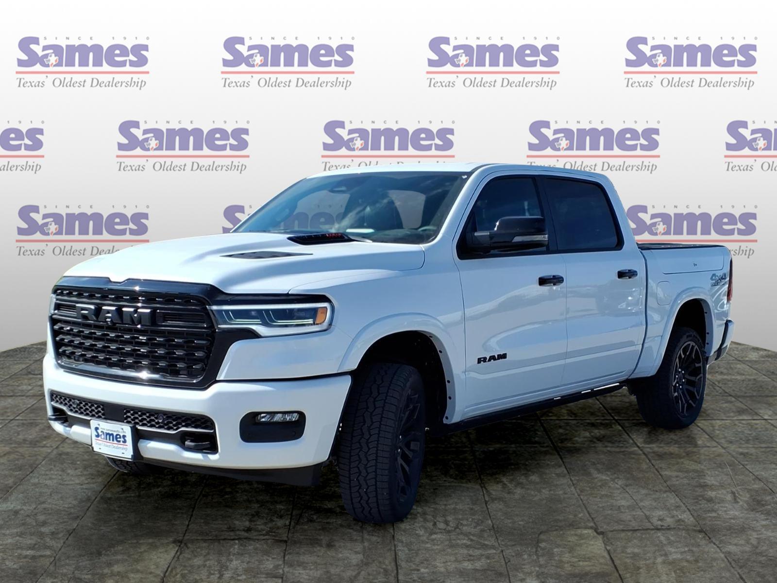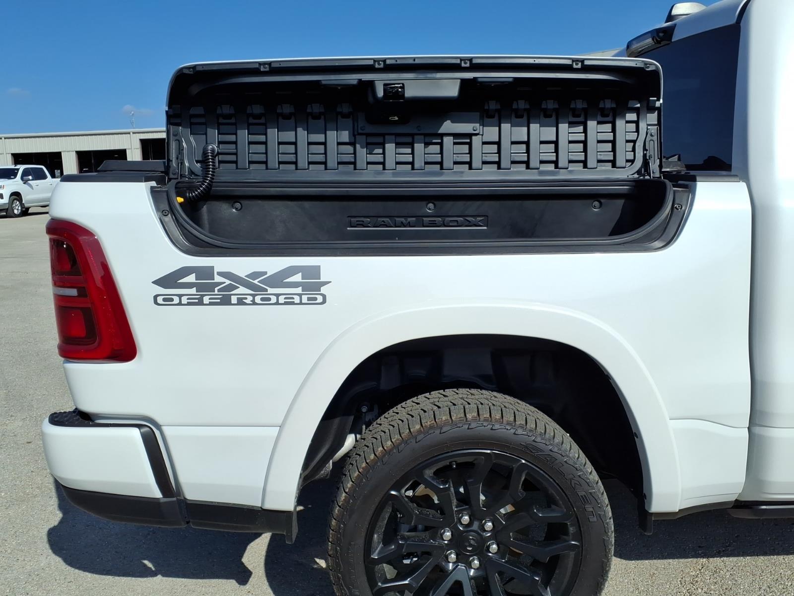 This 2026 Ram 1500 Limited in Ivory White Tri-Coat Pearlcoat comes with the following features: 3.0L I6 8-Speed Automatic 4WD Limited Level An Equipment Group (12-Way/1-Way Trailer Connector, 14.4Touchscreen Display, 240 Amp Alternator, 4G LTE Wi-Fi Hot Spot, Apple CarPlay, Connected Travel and Traffic Services, Connectivity - US/Canada, Disassociated Touchscreen Display, Drowsy Driver Detection, Evasive Steer Assist, Exterior 115V AC Outlet, Global Telematics Box Module, Google Android Auto, GPS Antenna Input, GPS Navigation, Hands-Free Active Driving Assist System, HD Radio, Heads-Up Display, Integrated Center Stack Radio, Integrated Voice Command with Bluetooth, Intersection Collision Assist System, LED CHMSL Lamp, Radio: Uconnect 5 Nav with 14.4Display, RamBox Cargo Management System, SiriusXM Radio Service, SiriusXM with 360L, Smartphone as a Key Capable, Surround View Camera System, Traffic Sign Recognition, Tri-Fold Tonneau Cover, and USB Host Flip), Night Edition (Accent Color Door Handles, Accent Color Premium Power Mirrors, Accent Color Tailgate Handle, Auto Power-Folding Mirrors, Auto-Dimming Exterior Driver Mirror, Black Day Light Opening Moldings, Black Exterior Truck Badging, Black Grille Surround Texture 7 Black, Black Headlamp Bezels, Black Painted Exterior Mirrors Caps, Black Tail Lamp Bezels, Body Color Front Bumper, Body Color Rear Bumper with Step Pads, Convex Wide-Angle Exterior Mirror Insert, Dual Exhaust with Black Tips, Exterior Mirrors Courtesy Lamps, Exterior Mirrors with Heating Element, Exterior Mirrors with Memory, Exterior Mirrors with Supplemental Signals, Pirelli Brand Tires, RAM Grille Badge - Black, Sport Performance Hood, and Wheels: 22x 9Premium Black Aluminum), Off Road Group (E-Locker Rear Axle, Falken Brand Tires, Front Extra Heavy Duty Shock Absorbers, Off Road Decals, Raised Ride Height, Rear Extra Heavy Duty Shock Absorbers, and Selec-Speed Control), Quick Order Package 22M Limited, 19 Speakers, 3.92 Rear Axle Ratio, 4-Wheel Disc Brakes, ABS brakes, Active Noise Control System, Adjustable pedals, Air Conditioning, Alloy wheels, AM/FM radio, Apple CarPlay/Android Auto, Audio memory, Auto High-beam Headlights, Auto-dimming door mirrors, Auto-dimming Rear-View mirror, Auto-leveling suspension, Automatic temperature control, Bodyside moldings, Brake assist, Bumpers: chrome, Chrome Exterior Mirrors, Compass, Delay-off headlights, Dome Dual LED Reading Lamp, Driver door bin, Driver vanity mirror, Dual front impac