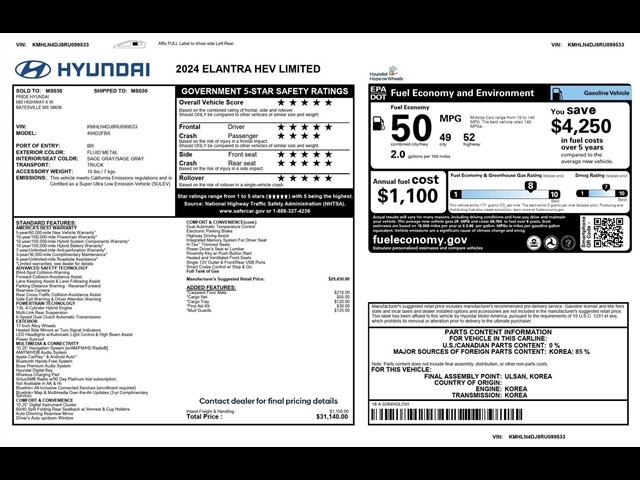 SUMMARY Clean Carfax! One Owner!**WARRANTY REMAINING: 43 MONTHS OR 25,420 MILES**CARPETED FLOOR MATS, MUD GUARDS, CARGO TRAY, CARGO NET, FIRST AID KIT, 1.6L, 6-SPEED DUAL CLUTCH AUTOMATIC TRANSMISSION, HEV, KEYLESS ENTRY, PUSH BUTTON START, REMOTE START, POWER SUNROOF, HEATED & COOLED FRONT SEATS, POWER DRIVER SEAT WITH MEMORY, 10.25 IN SCREEN DISPLAY, APPLE CARPLAY, ANDROID AUTO, BLUETOOTH FOR HANDS-FREE PHONE, BOSE PREMIUM AUDIO SYSTEM, SMART CRUISE CONTROL W/ STOP & GO, REARVIEW CAMERA, WIRELESS CHARGING PAD, LED HEADLIGHTS, POWER HEATED MIRRORS, BLIND-SPOT COLLISION-WARNING, FORWARD COLLISION-AVOIDANCE ASSIST, LANE KEEPING ASSIST & LANE FOLLOWING ASSIST, PARKING DISTANCE WARNING - REVERSE/FORWARD, REAR CROSS-TRAFFIC COLLISION-AVOIDANCE ASSIST, SAFE EXIT WARNING & DRIVER ATTENTION WARNING, ELECTRONIC PARKING BRAKE, HIGHWAY DRIVING ASSIST EQUIPMENT Convenience The cruise control system gets information from GPS navigation data so it knows when to slow down for curves. The cruise control system gets information from GPS navigation data so it knows when to slow down for curves.Safety and Security With this system the drivers hands must remain on the wheel at all times but can be removed briefly (for a few seconds), otherwise the vehicle will prompt the driver to put their hands back on the wheel. The vehicle constantly monitors the roadway in front of the vehicle and identifies and tracks pedestrians on an interior display. If the system determines a likely impact, it will automatically take preventative steps to avoid hitting the pedestrian.Technology and Telematics Without the need for a manufacturer specific app to be installed on the smart device, the vehicle infotainment system