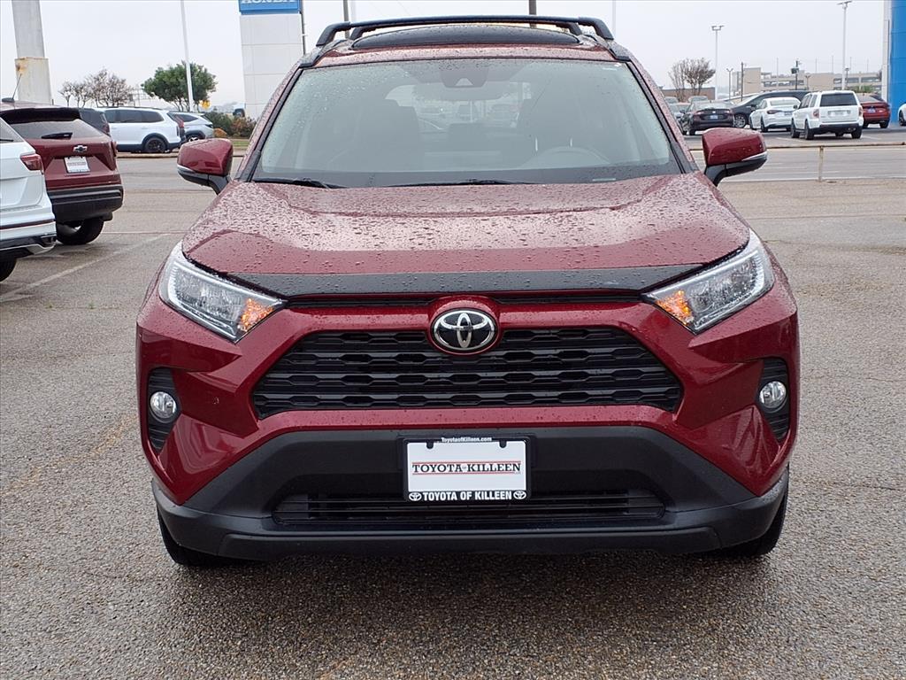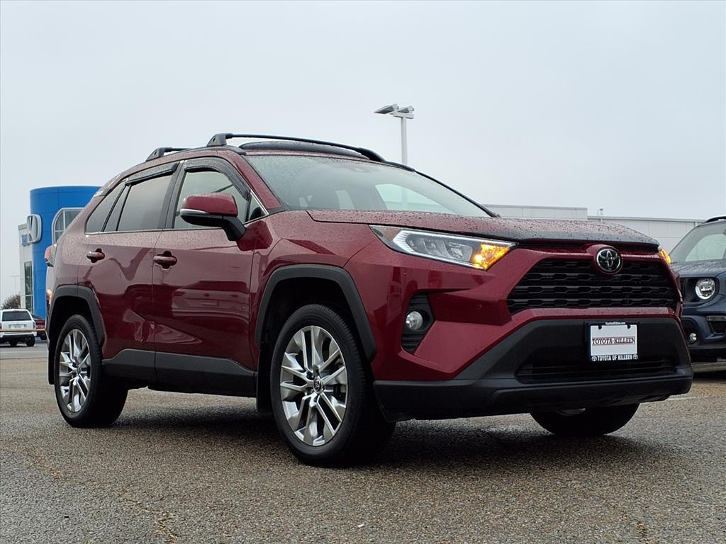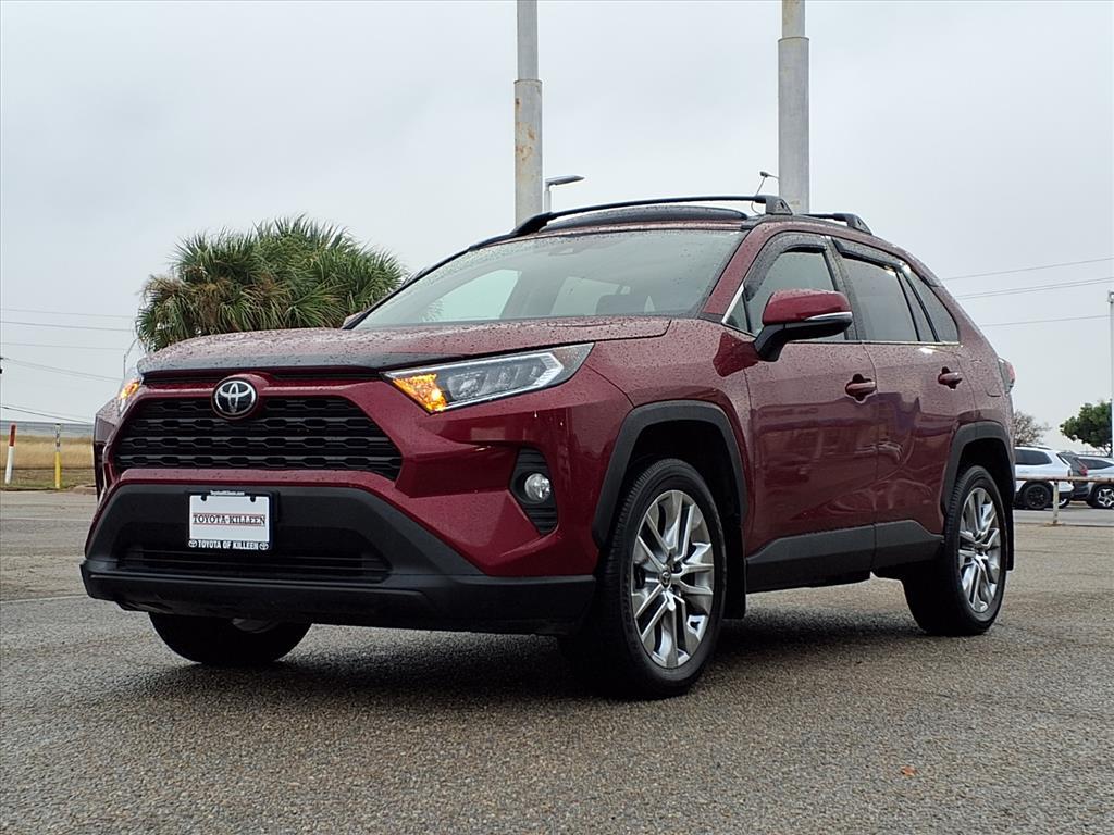 CARFAX One-Owner. Ruby Flare Pearl 2021 Toyota RAV4 XLE Premium FWD 8-Speed Automatic 2.5L 4-Cylinder DOHC Dual VVT-i Toyota of Killeens promise is that every interaction with a member of Toyota of Killeen will be simple, straight forward, and satisfaction guaranteed! Odometer is 35568 miles below market average! 28/35 City/Highway MPG 3 Spoke Leather Steering Wheel, 4-Wheel Disc Brakes, 6 Speakers, ABS brakes, Air Conditioning, Alloy wheels, AM/FM radio: SiriusXM, AM/FM Stereo, Apple CarPlay/Android Auto, Auto High-beam Headlights, Automatic temperature control, Axle Ratio: 3.177, Brake assist, Bumpers: body-color, Delay-off headlights, Driver door bin, Driver vanity mirror, Dual front impact airbags, Dual front side impact airbags, Electronic Stability Control, Emergency communication system, Exterior Parking Camera Rear, Four wheel independent suspension, Front anti-roll bar, Front Bucket Seats, Front Center Armrest, Front Door Smart Key System w/Push Button Start, Front dual zone A/C, Front fog lights, Front reading lights, Fully automatic headlights, Heated door mirrors, Illuminated entry, Knee airbag, Leather Shift Knob, Low tire pressure warning, Occupant sensing airbag, Outside temperature display, Overhead airbag, Overhead console, Panic alarm, Passenger door bin, Passenger vanity mirror, Power door mirrors, Power driver seat, Power Liftgate, Power moonroof, Power steering, Power windows, Radio data system, Rear anti-roll bar, Rear seat center armrest, Rear window defroster, Rear window wiper, Remote keyless entry, Roof rack: rails only, SofTex Seat Trim, Speed control, Speed-sensing steering, Split folding rear seat, Spoiler, Steering wheel mounted audio controls, Tachometer, Telescoping steering wheel, Tilt steering wheel, Traction control, Trip computer, Turn signal indicator mirrors, Variably intermittent wipers, and Wheels: 19Multi-Spoke Super Chrome Alloy.