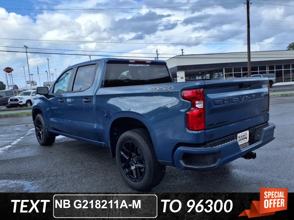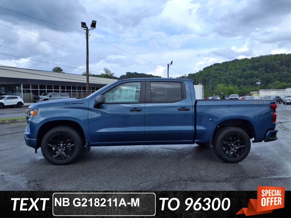 Lakeshore Blue Metallic 2024 Chevrolet Silverado 1500 Custom 4WD 8-Speed Automatic 2.7L I4 Turbocharged DOHC 16V LEV3-SULEV30 310hp This Vehicle Includes the Following Features:, Backup Camera, Bluetooth, Apple Carplay/ Android Auto, Collision Avoidance System, Collision Warning Alert System, Lane Departure Warning System, Blind Spot Monitors, Heated Front Seats, Touchscreen Controls, Keyless Access/ Keyless Entry, Push Button Start, Automatic Headlights, Bluetooth Streaming Audio, Remote Engine Start/ Keyless Entry, Sirius XM Radio, Tow Package, Power Seats, Alloy Wheels, Security System, Steering Wheel Controls, Brake Assist, Trailer Package, New Tires, New Brakes, Cruise Control, LED Headlights, Off Road Package, Power Package, 4WD, 8-Speed Automatic, 4WD, Black Cloth, 10-Way Power Driver Seat w/Lumbar, 120-Volt Interior Power Outlet, 3.5Monochromatic Display Driver Info Center, Black Chrome Exhaust Tip (LPO), Bluetooth� For Phone, Chevytec Spray-On Black Bedliner, Color-Keyed Carpeting Floor Covering, Custom Convenience Package, Custom Value Package, Dark Appearance Package, Deep-Tinted Glass, Dual Rear USB Ports (Charge Only), Electrical Steering Column Lock, Electronic Cruise Control, Front Frame-Mounted Black Recovery Hooks, Front Rubberized Vinyl Floor Mats, HD Rear Vision Camera, High Capacity Suspension Package, Manual Tilt Wheel Steering Column, OnStar & Chevrolet Connected Services Capable, Power Front Windows w/Driver Express Up/Down, Power Front Windows w/Passenger Express Down, Power Rear Windows w/Express Down, Preferred Equipment Group 1CX, Rear 60/40 Folding Bench Seat (Folds Up), Rear Rubberized-Vinyl Floor Mats, Remote Keyless Entry, Single Outlet Exhaust, SiriusXM Radio, Standard Tailgate, Trailering Package, Wheels: 20x 9High Gloss Black Painted Alum. Custom Convenience Package (Electric Rear-Window Defogger, EZ Lift Power Lock & Release Tailgate, LED Cargo Area Lighting, Remote Vehicle Starter System, and Theft Deterrent System (Unauthorized